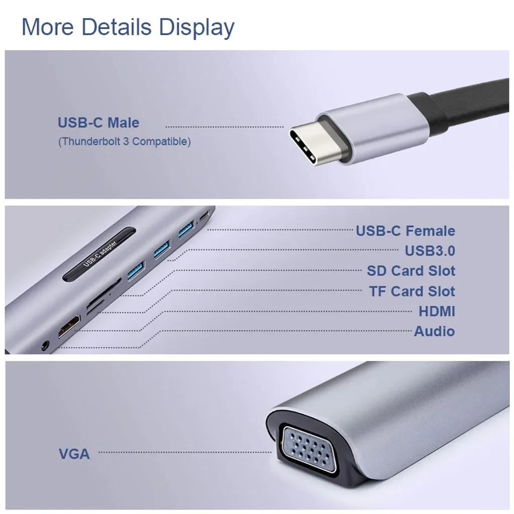 What Interface This Multiport Thunderbolt 3 Compatible Adapter Contained:USB3.1 type-c Male, Does support hot swap,connecting to your usb-c dp alternate mode supportable laptopsHDMI v2.0 Female,Max Support to Display Resolution to 4k 3840*2160 30Hz Individually.VGA 15pin Female,Max Support to display Resolution to 1920x1080 with 60Hz.(HDMI and VGA can be connected Simultaneously,but only supports to display same contents in your external monitors)USB3.0 Female,Max Support Data Transmissions Rate to 5Gbps,Backwards compatible with USB2.0 and USB1.1SD Card,With USB3.0 Transmissions Rate(For reference)TF Card,With USB3.0 Transmissions Rate(For reference)(TF and SD can use Simultaneously)Audio 3.5mm Female Jack,connect audio cable to external speakers get sound.(Only VGA connecting to VGA displays ,you can connect from adapter's 3.5mm audio jack to output sound) USB-C PD Power Delivery Female Port,support to charge your laptop when you are using.Important Notes: