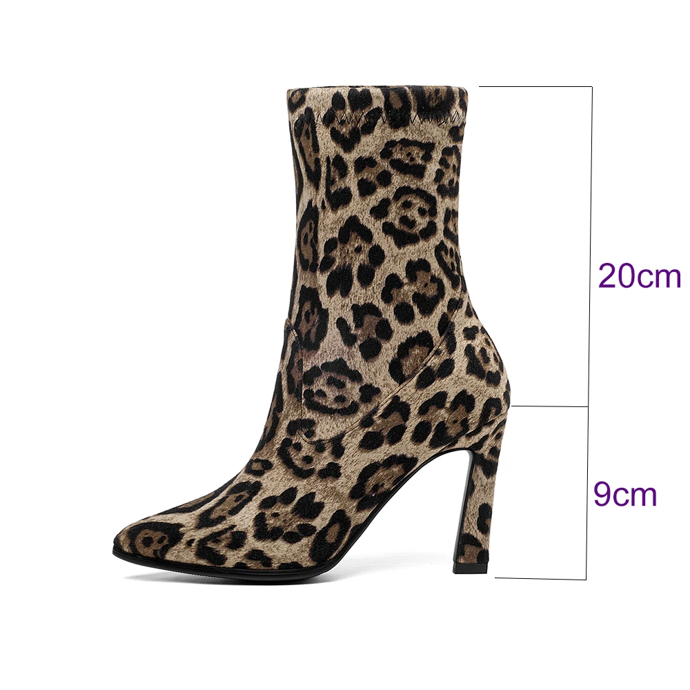 Женские сапоги-носки; Ботильоны на высоком каблуке с леопардовым принтом; Женские модные эластичные сапоги на шпильках с острым носком; Большие размеры 34-43