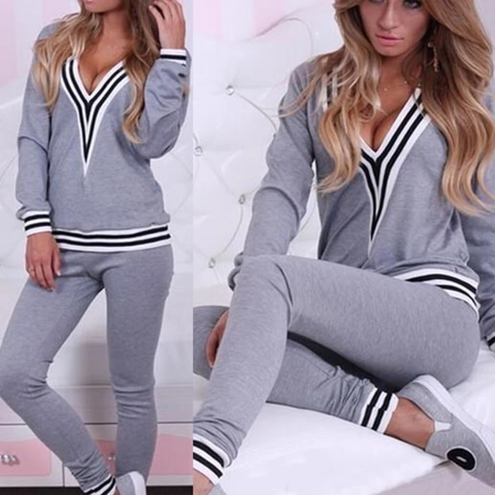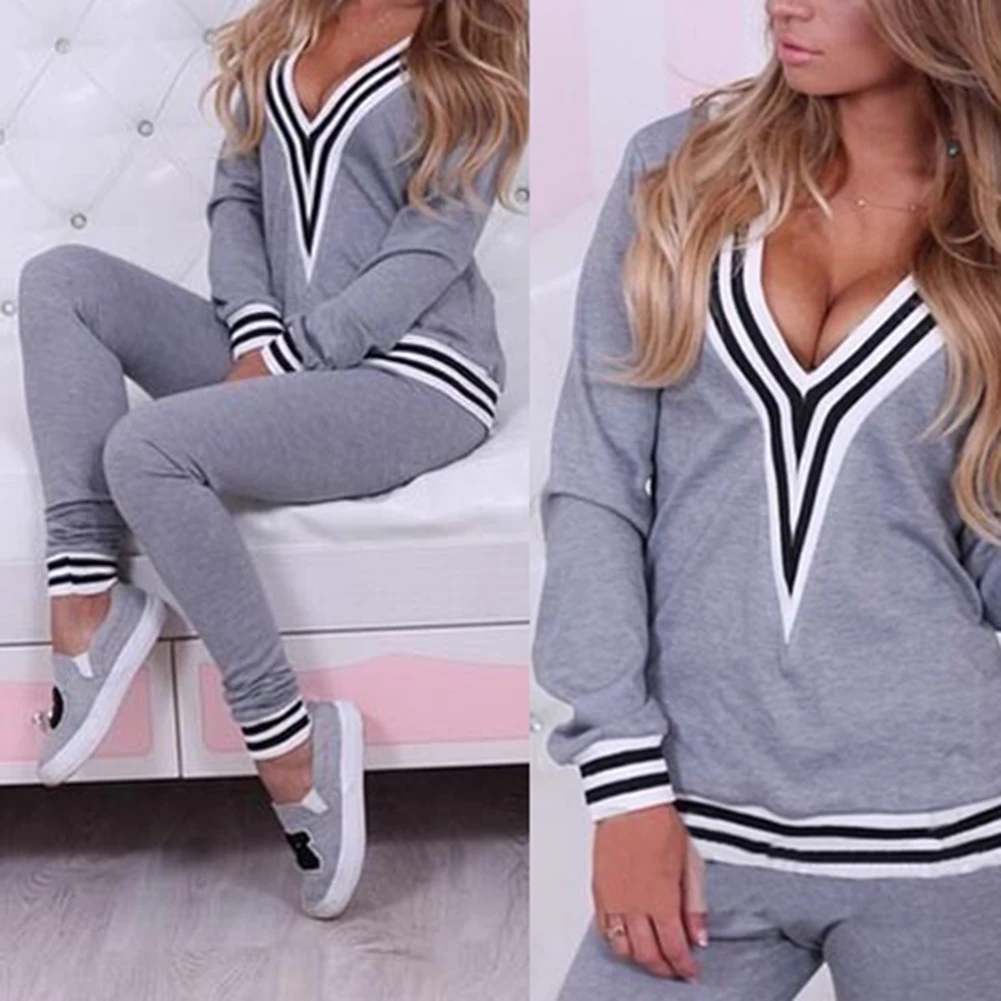 2 шт./компл. Женская Повседневная подол в полоску с v-образным вырезом Свитшот и штаны, хлопковый спортивный костюм, тренировочный костюм