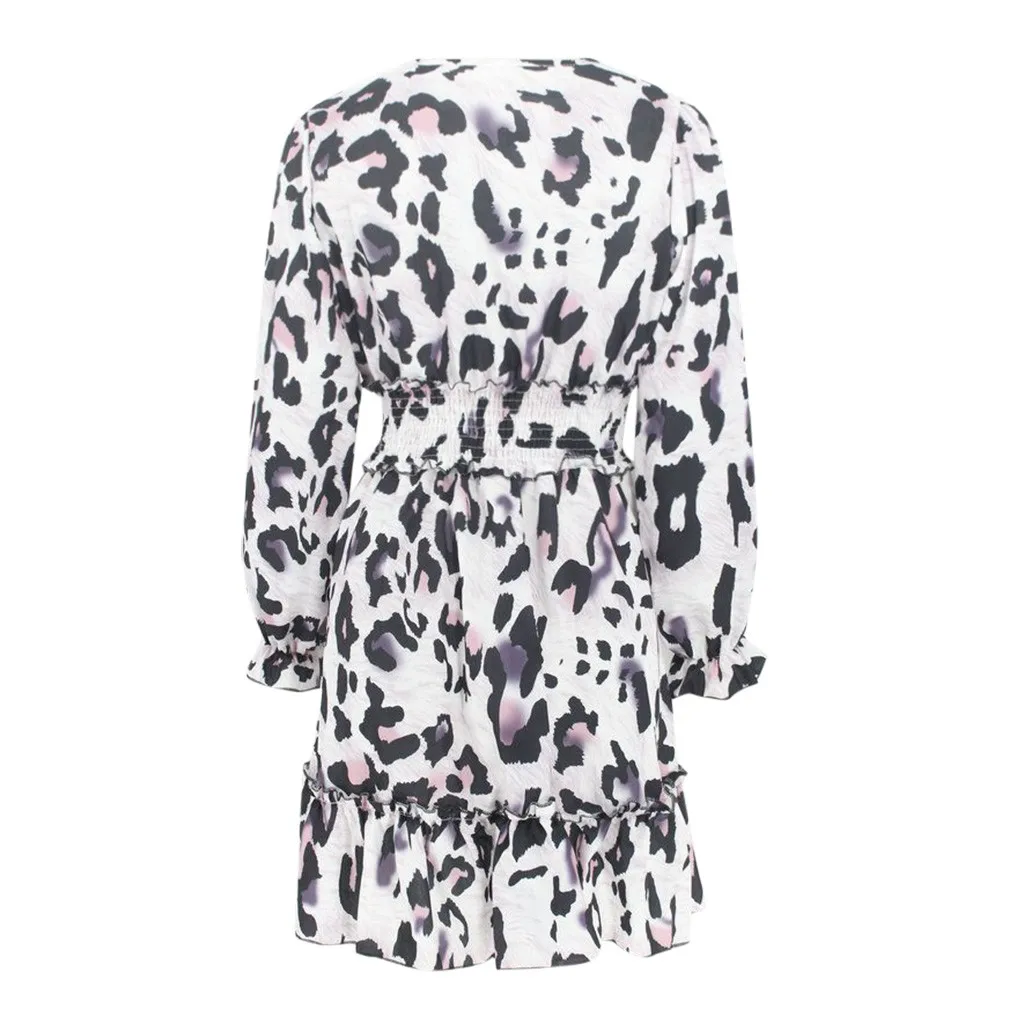 Fashion Women Square Neck Puff Sleeve Leopard Print Short Fit Party Club Dress