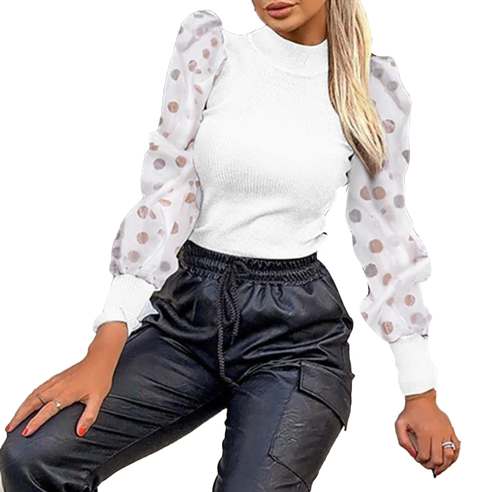 Women Autumn Polka Dot Long Mesh Puff Sleeve Ribbed Sweater Bottoming Shirt