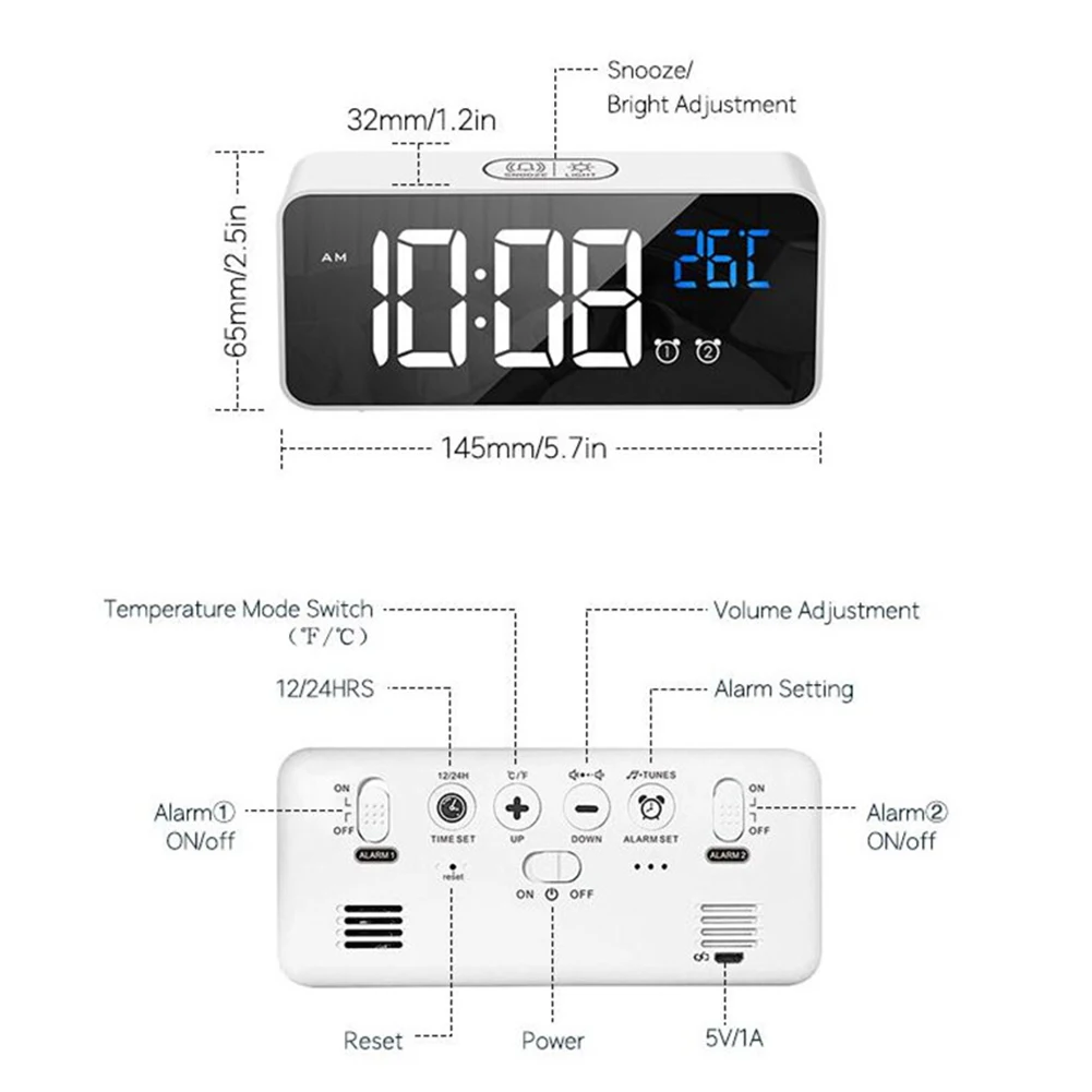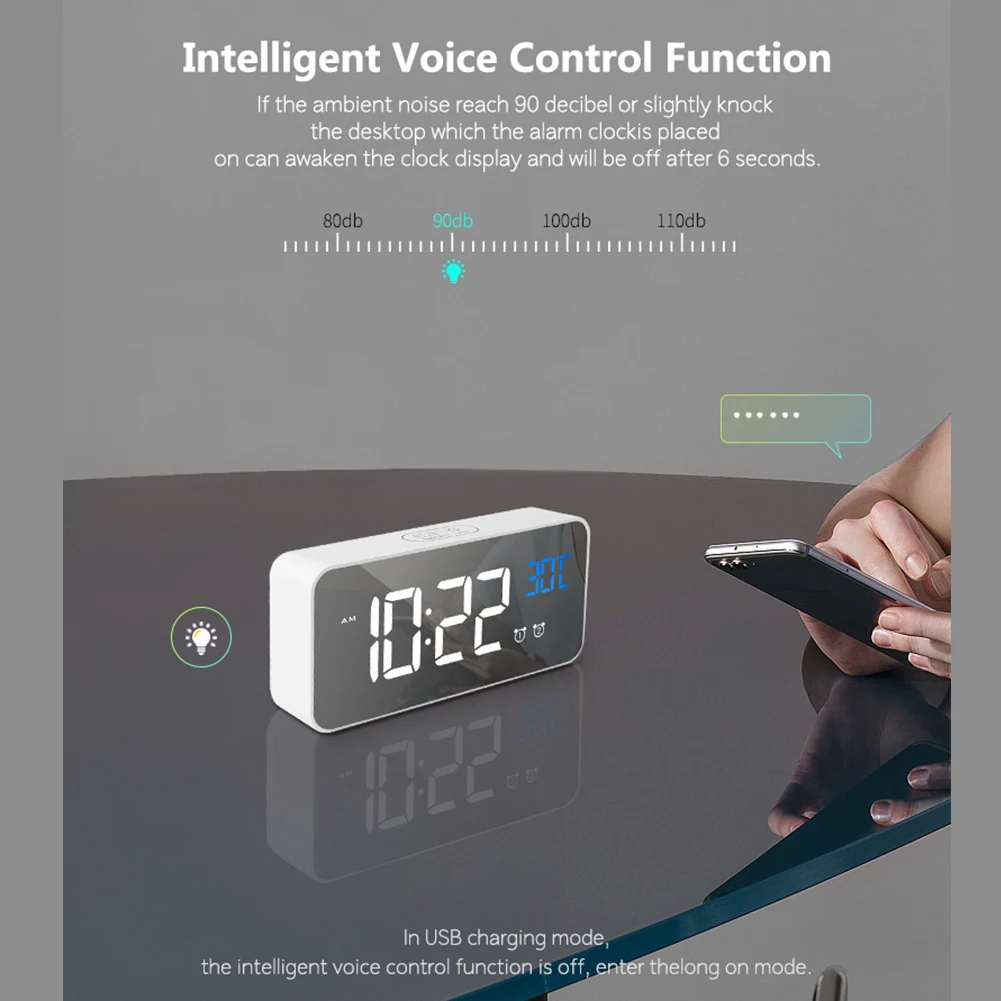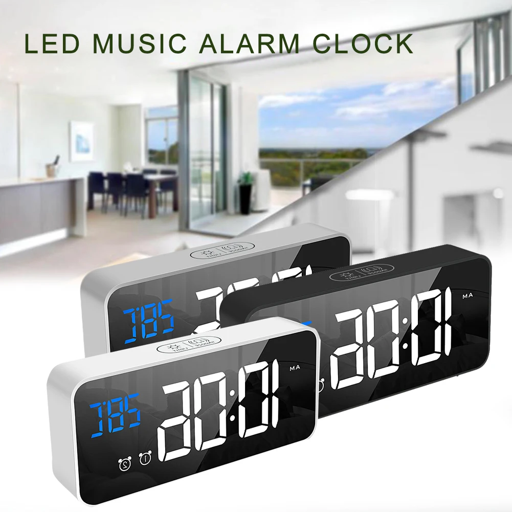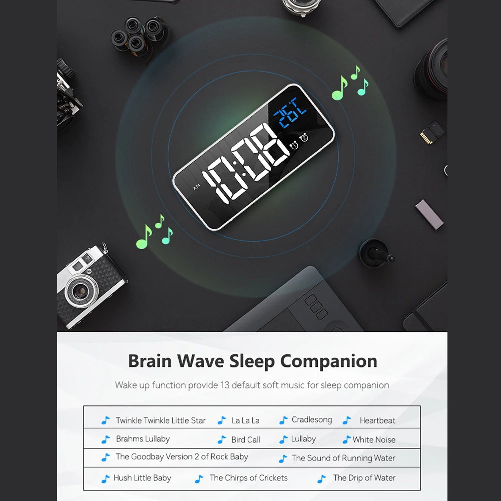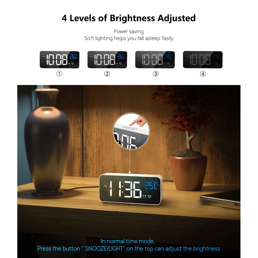 Название продукта: цифровой будильник с большим светодиодный дисплеем температуры, портативный зеркальный будильник с двойным сигналом повтора времени 4 Уровня Регулируемая Яркость Диммер