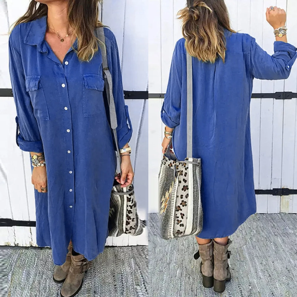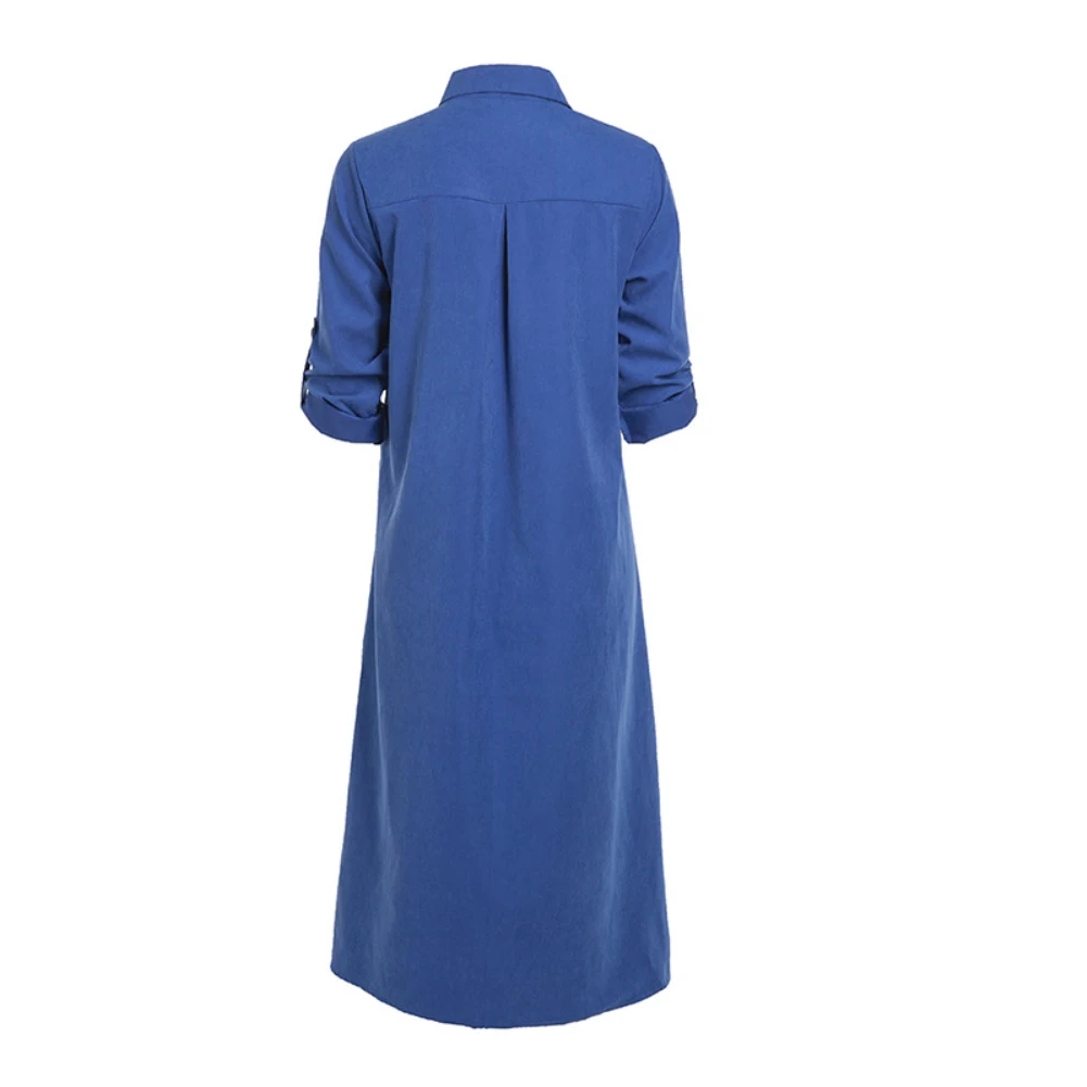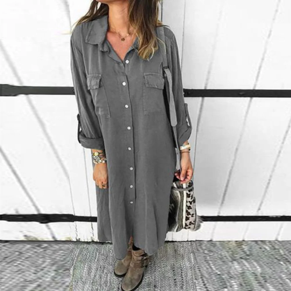 Женское однобортное платье-рубашка макси с отложным воротником, длинными рукавами и карманами