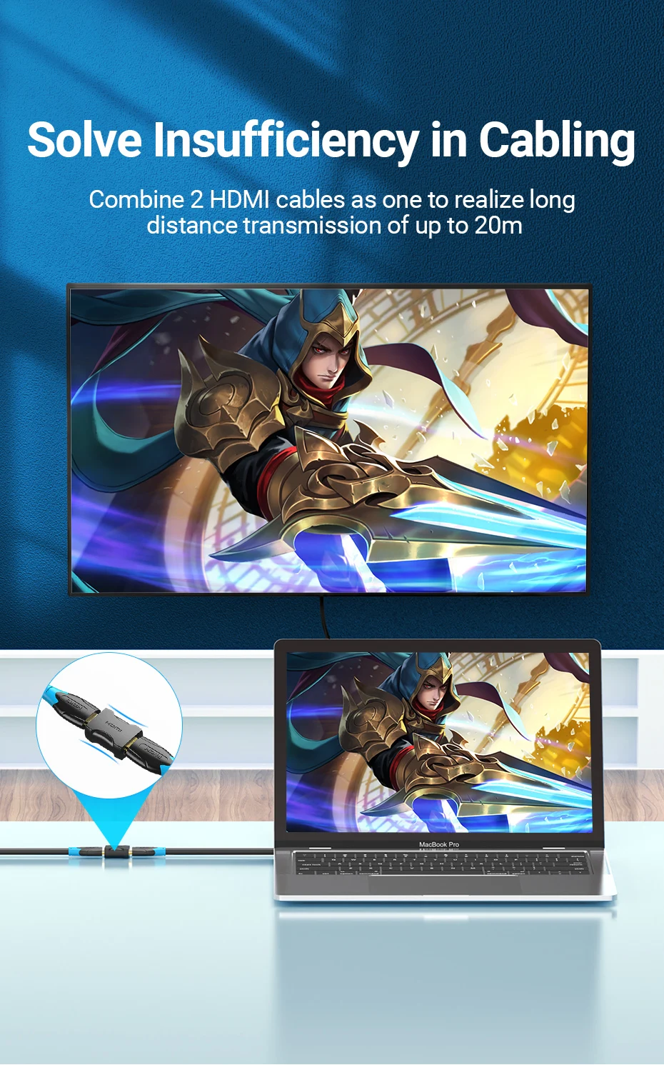 Combine 2 HDMI cables as one to realize long distance transmission of up to 20m.