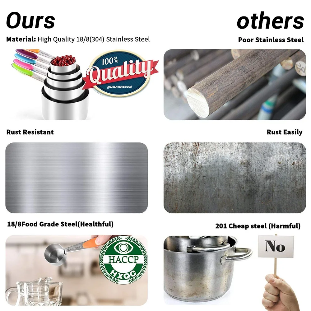 * Полный набор из 10: включает 1/8 стакана, 1/4 стакана, 1/3 стакана, 1/2 стакана, 1 стакана и 1/4 tsp, 1/2 tsp, 1 tsp, 1/2 tsp, 1 tsp, всего 10 размеров, чтобы удовлетворить все ваши потребности. * Больше нет догадки: Каждая чашка «мл» и размеры чашки прошли четкую гравировку маркировки, и вы можете быстро определить масштаб чашки в соответствии с цветом ручки. Больше нет предположения на кухне! * Безопасно готовьте с 18/8 сталью: мы знаем, что вы беспокоитесь о ржавчине или BPA-infested пластике. Не волнуйтесь, все наши продукты изготовлены из пищевой стали 18/8, они не будут загрязнены или эрозированы, сделают вашу еду всегда безопасной и здоровой. * Специальный дизайн для использования лучше: 18/8 стальной материал сохраняет его крепким, не ломаясь, чехол, высококачественная сталь делает его безопасным в посудомоечной машине, удобно помещается внутри друг друга дизайн позволяет хранить их в любом ящике. Удобство вашей жизни.