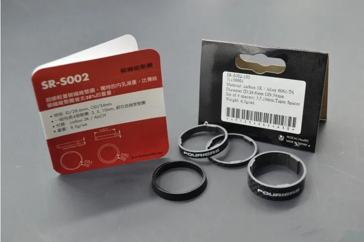 Product Features: Set of 4 spacers: 3, 5, 10mm, Taper Spacer Material: Carbon 3K / Alloy 6061-T6 Diameter ID: Ø28.6 OD: Ø34 Weight: 8.3g/set