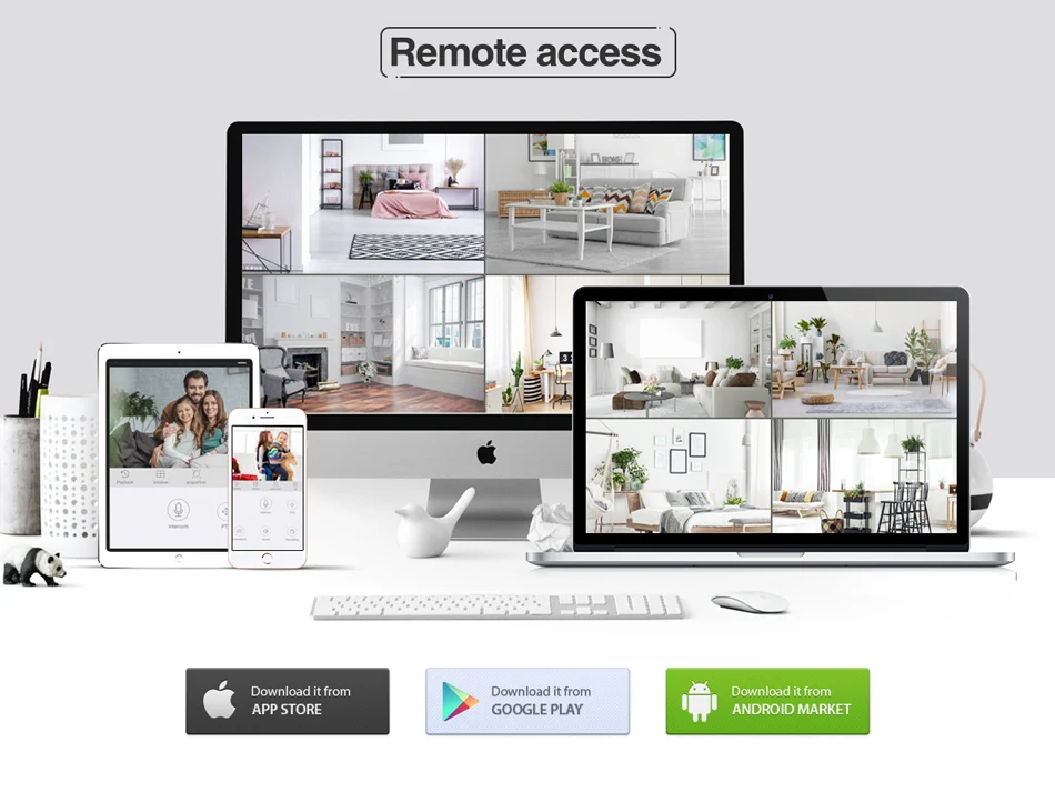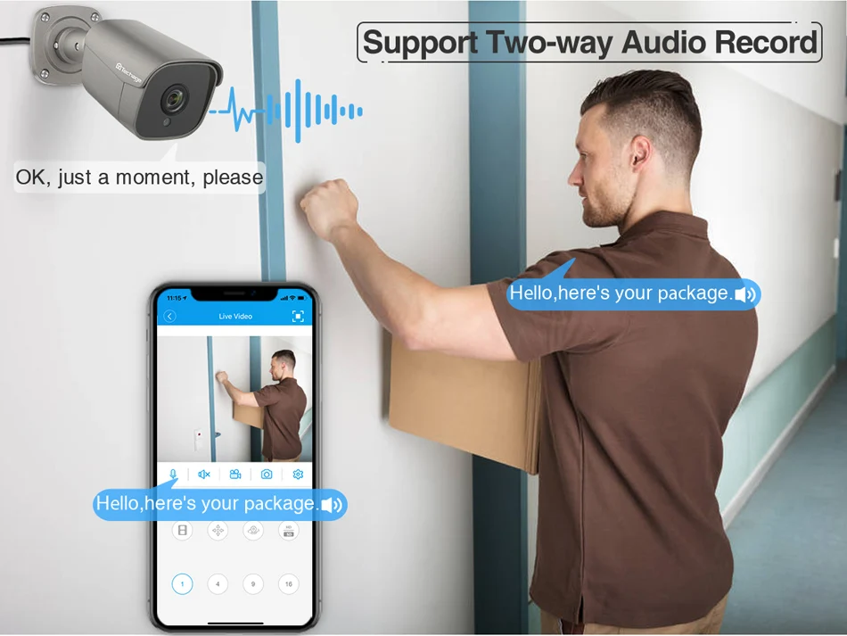На основе технологии P2P (peer to peer), поддержка установки plug-and-play. Доступ к ip-камере через веб-интерфейс через Интернет-проводник, также поставляется с бесплатным приложением для смартфонов (Android и iPhone) для удаленного просмотра из любого места.