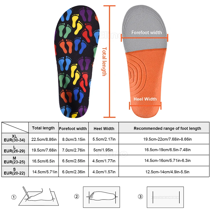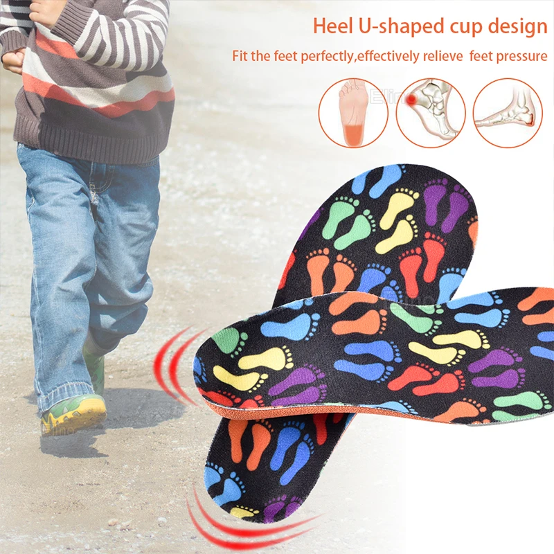 3. The children insoles has arch design, fit to the foot, balanced force, walking more light and comfortable. Designed for flat feet, plantar fasciitis, heel varus, O/X leg design. Effectively relieves the pain.