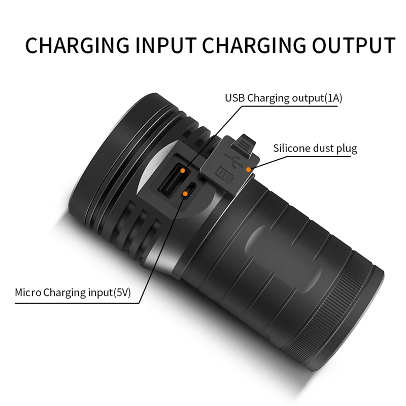 * Модель: многофункциональный фонарик * Материал изделия: алюминиевый сплав * Технология поверхности: износостойкое анодирование * Водонепроницаемость: IPX5 (светильник, дождь, брызги воды) * Цвет: белый, светильник * Светодиодный Цветовая температура: 7500K * 3 режима переключения: высокий, слабый, стробоскоп * Радиус действия: 300-500 метров * Защита от заряда и разряда: Встроенный перезаряд * И перегрузка IC. Продлевает срок службы батареи * Питание: четыре аккумулятора 18650 * Индикация мощности: когда достаточно питания, * Светодиодный зеленый цвет. Когда питание недостаточно, светодиодный красный цвет. * Индикация зарядки: при зарядке красный светильник О. После полной зарядки, включен зеленый светильник. * Емкость аккумулятора: 10400 мАч * Время зарядки: 6 ~ 10 часов * Вход и выход: 5 В/1 А (Не используйте зарядное устройство 9 В. Фонарик может быть уничтожен) • Рабочее напряжение: 3,7 V * Размеры: 118 мм (длина), 61 мм (головка) Диаметр), 50 мм (диаметр наконечника) * Вес нетто: 360 г (разные лампы имеют вес Отклонения) * Посылка включает в себя: фонарик, веревка, 0,5 м кабеля USB