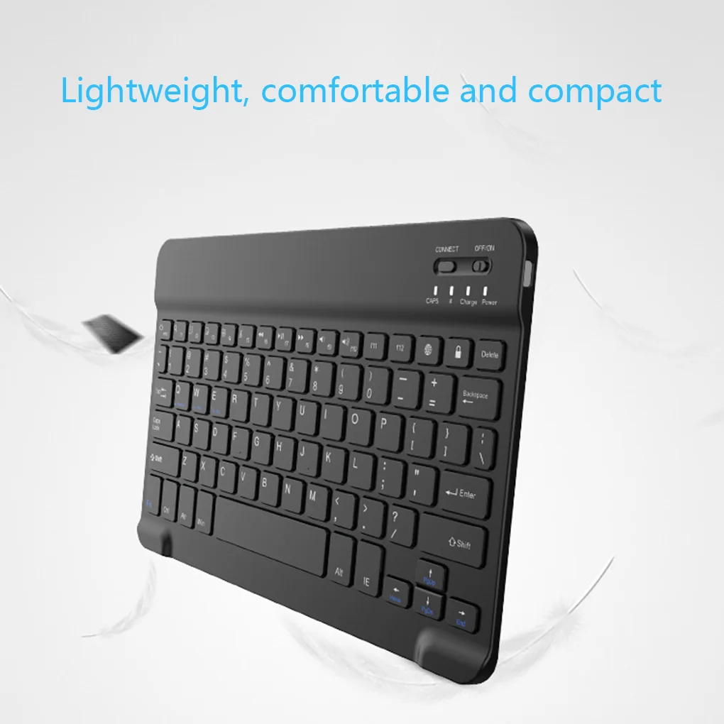 Универсальная беспроводная клавиатура для планшета имеет небольшой размер и весовой светильник, который легко и удобно носить с собой.