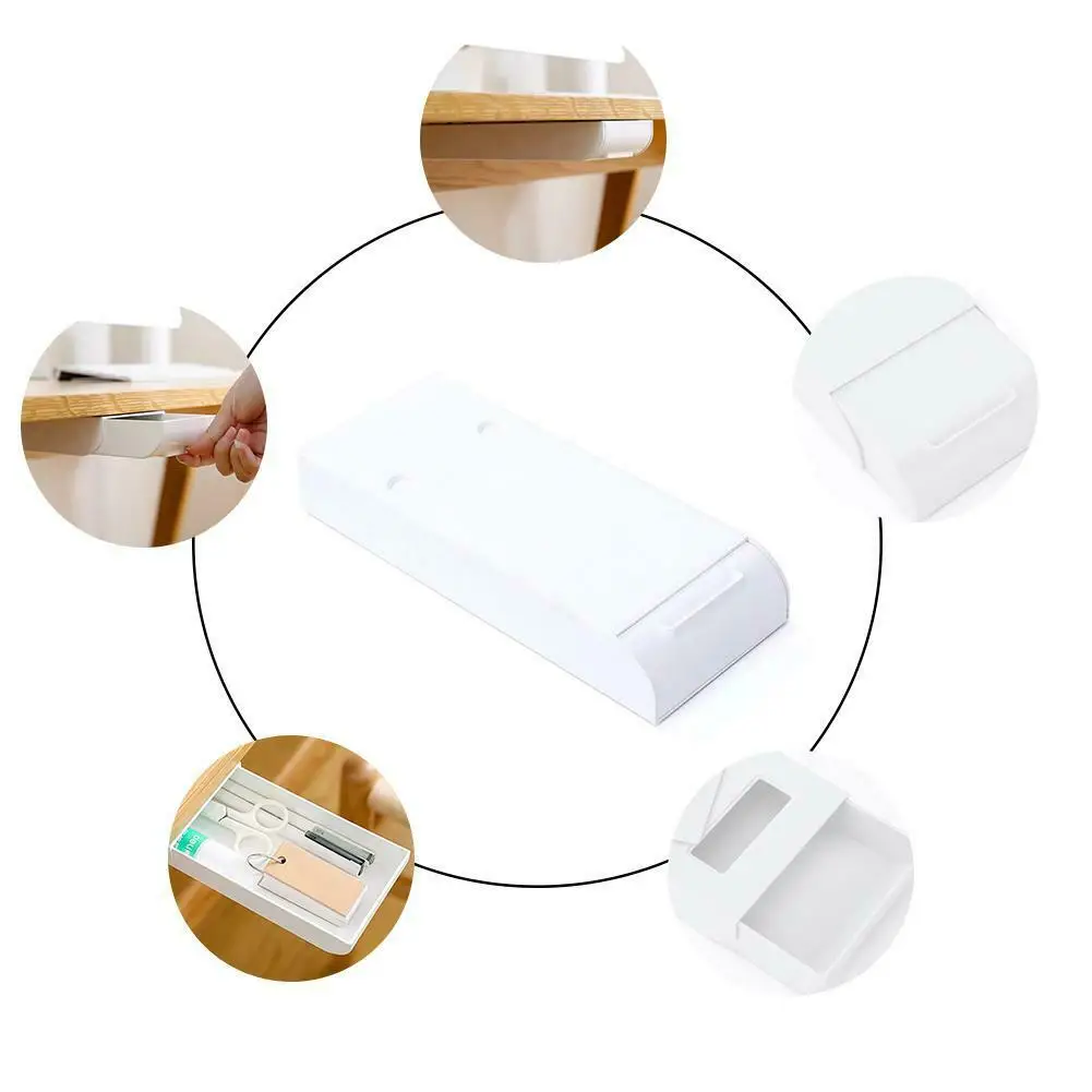 Преимущества: используется не только для ручек и канцелярских принадлежностей, но и для сотовых телефонов, наушников и других предметов. И сделайте ваш рабочий стол чистым и аккуратным. Скрытое хранилище: скрытое в нижней части рабочего стола, не занимает настольное пространство, отказывается от запутывания рабочего стола, чтобы освободить больше офисного пространства. Он имеет определенную степень конфиденциальности для защиты ваших личных предметов хранения. Простота установки: с самоклеющейся клейкой лентой легко вытяните ее и нажмите под столом, легко устанавливается и удаляется. Создайте хранилище в неиспользованном пространстве под шкафом/полкой.