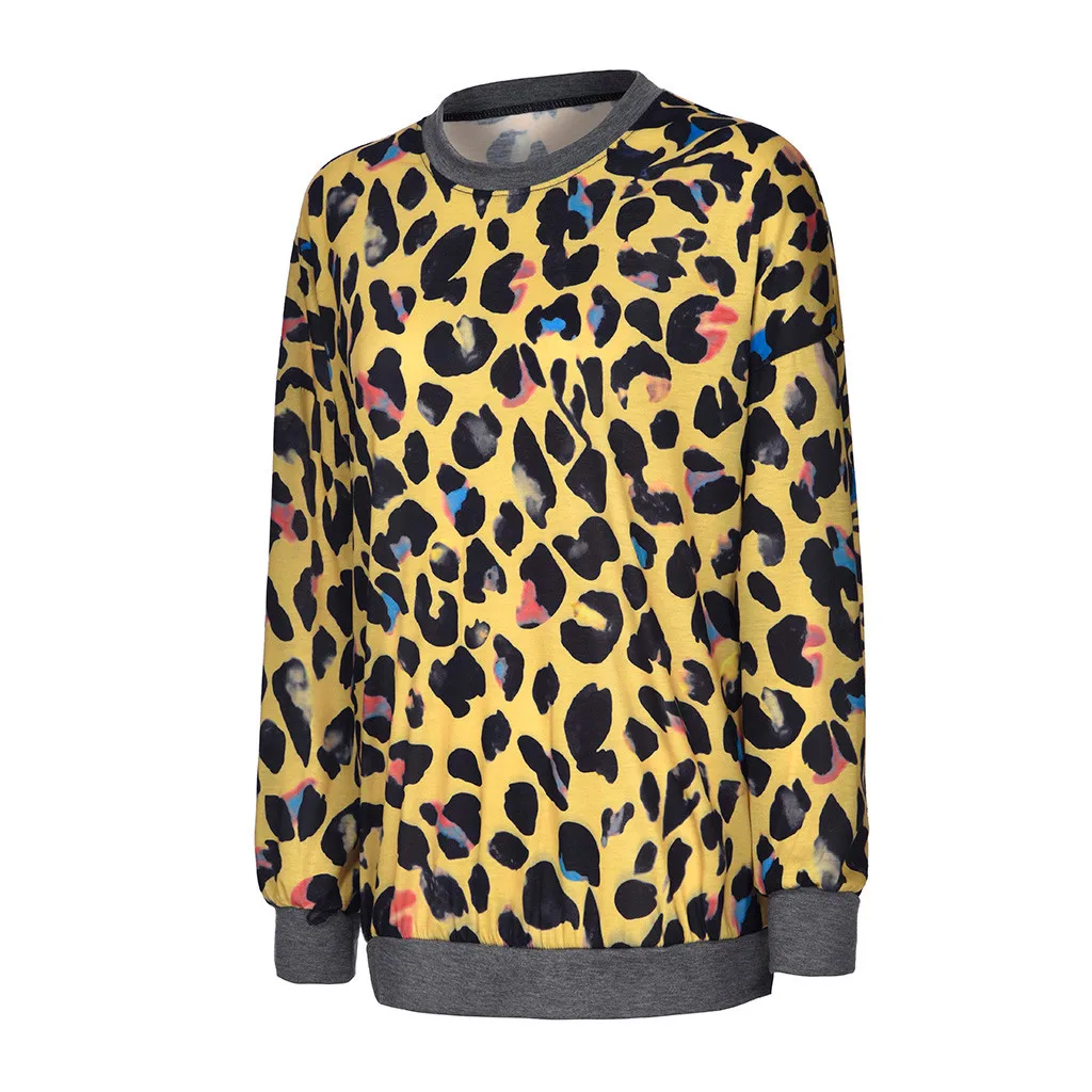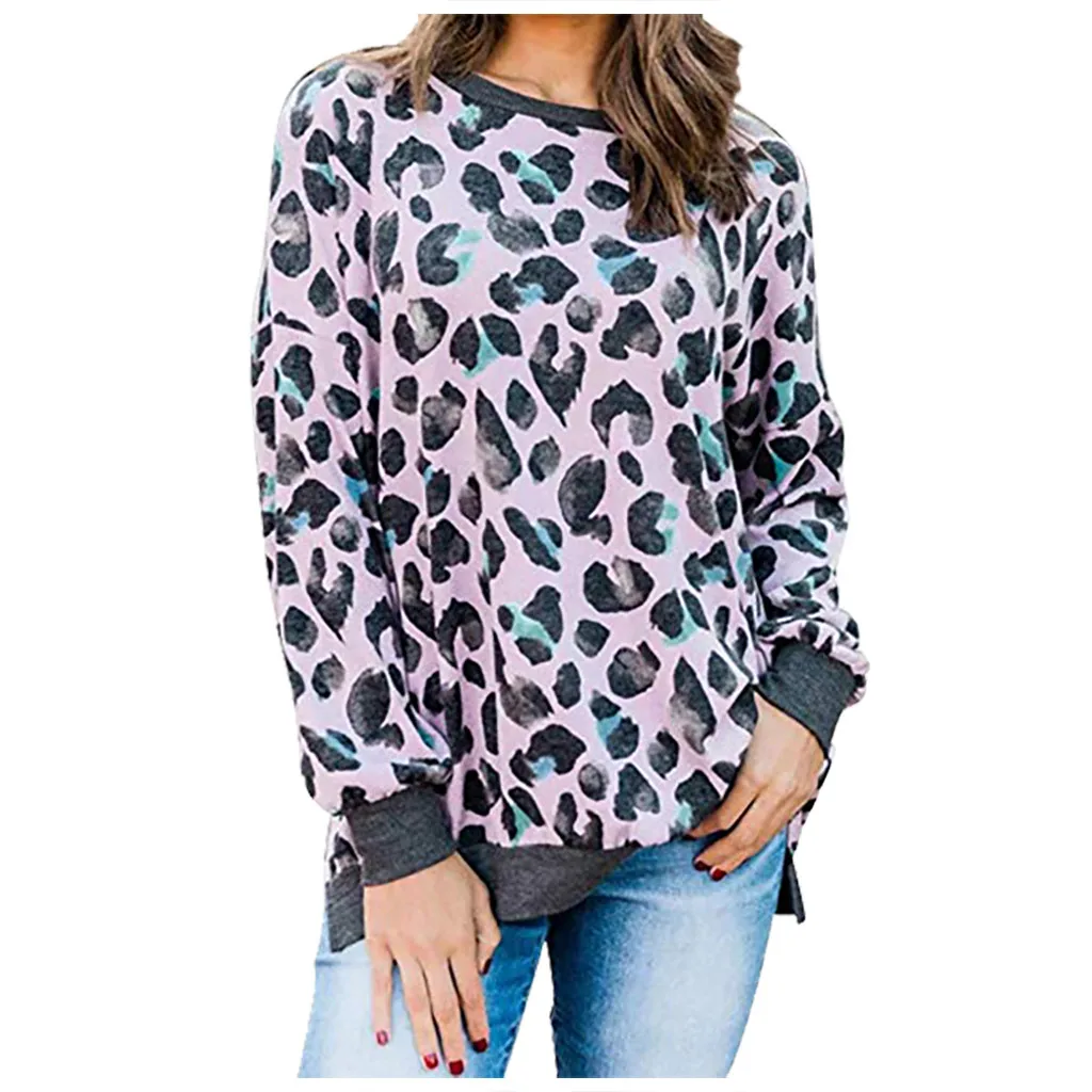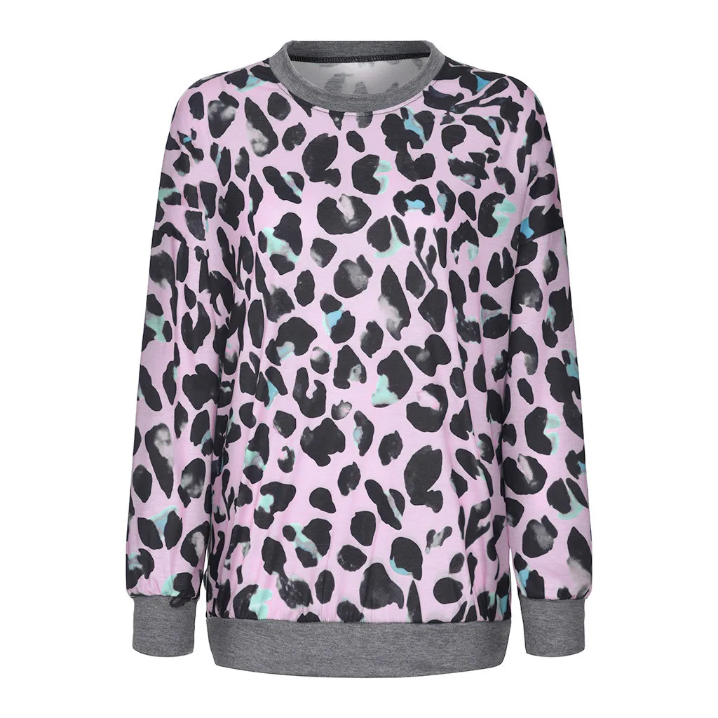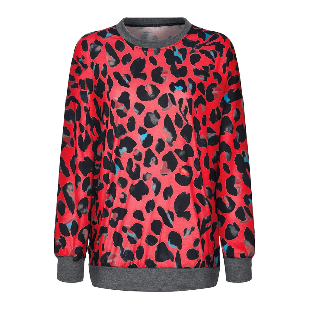 Женская свободная леопардовая блузка с круглым вырезом и длинным рукавом, пуловер, топы, рубашка