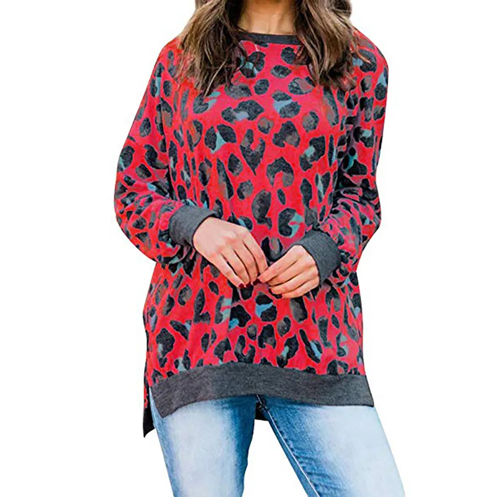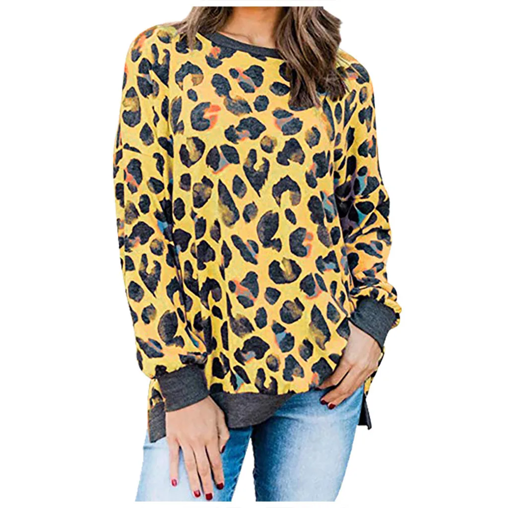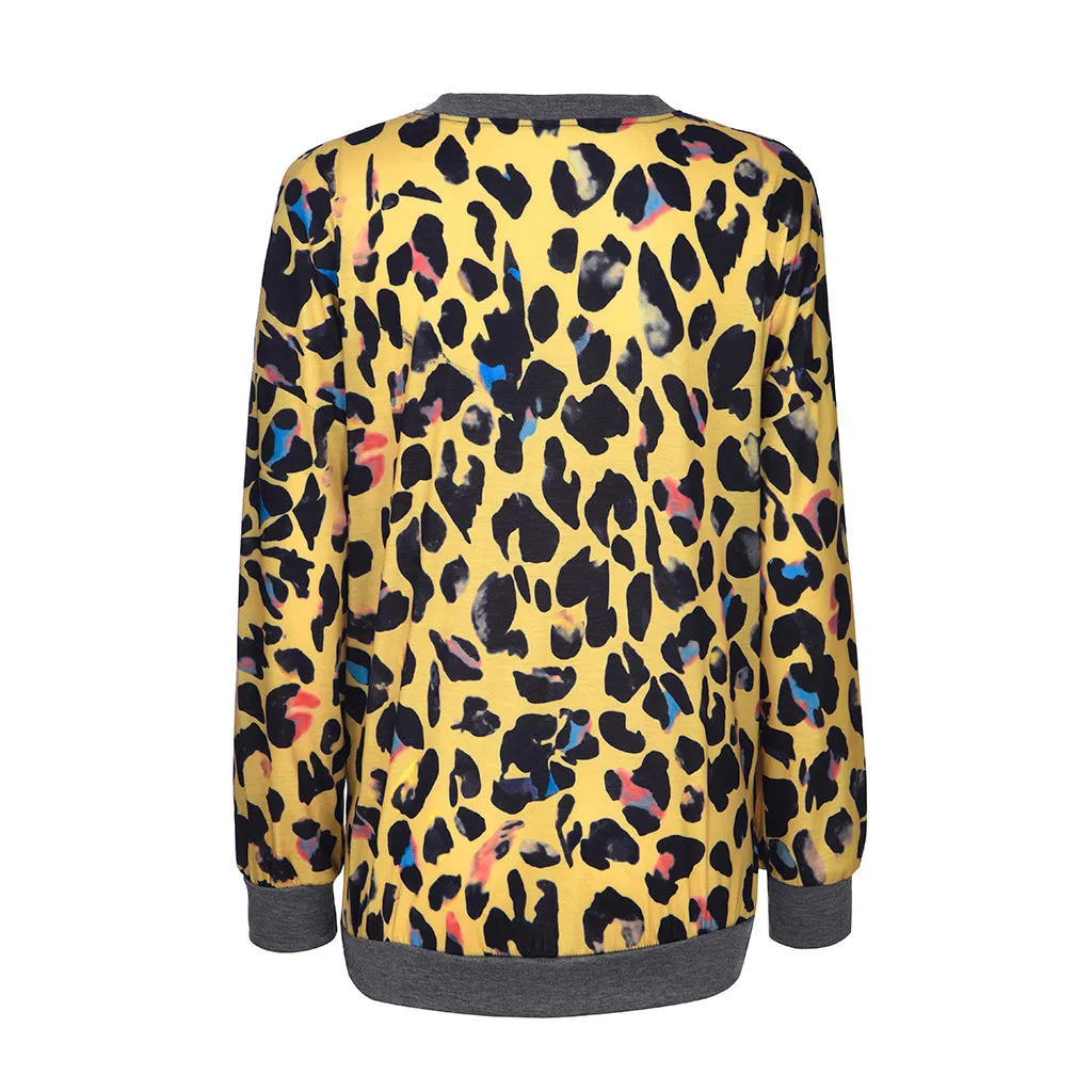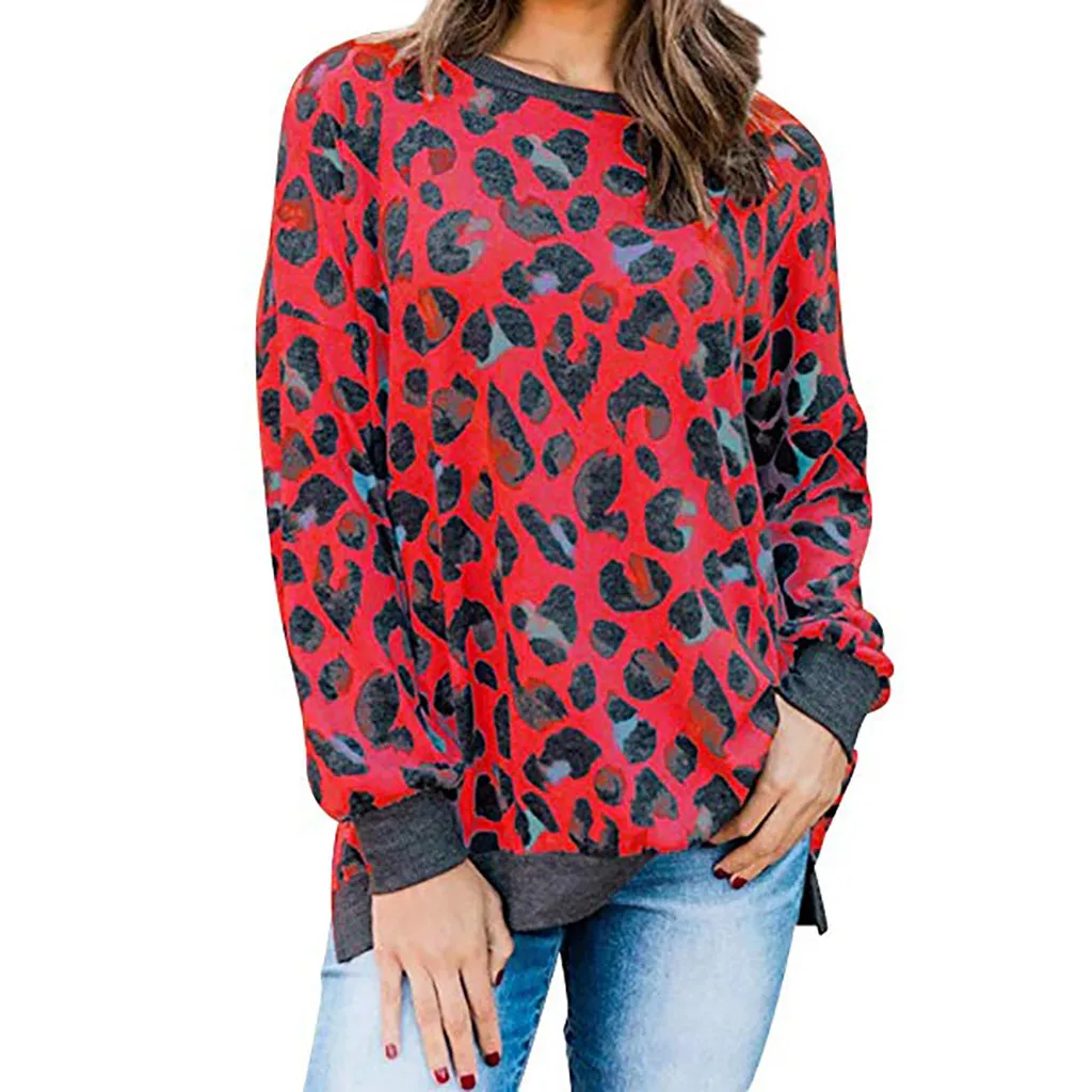 Женская свободная леопардовая блузка с круглым вырезом и длинным рукавом, пуловер, топы, рубашка