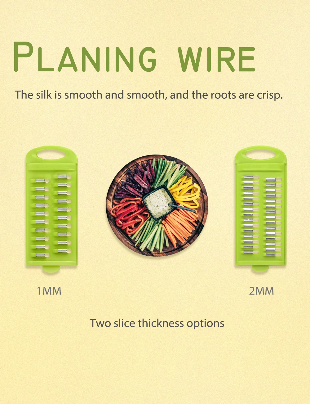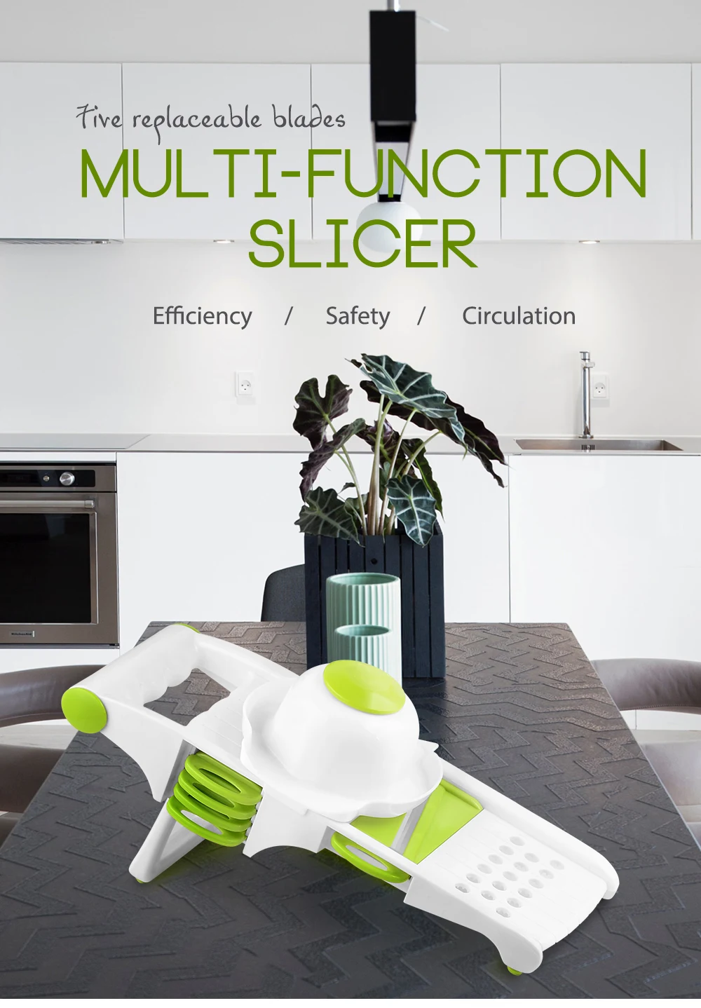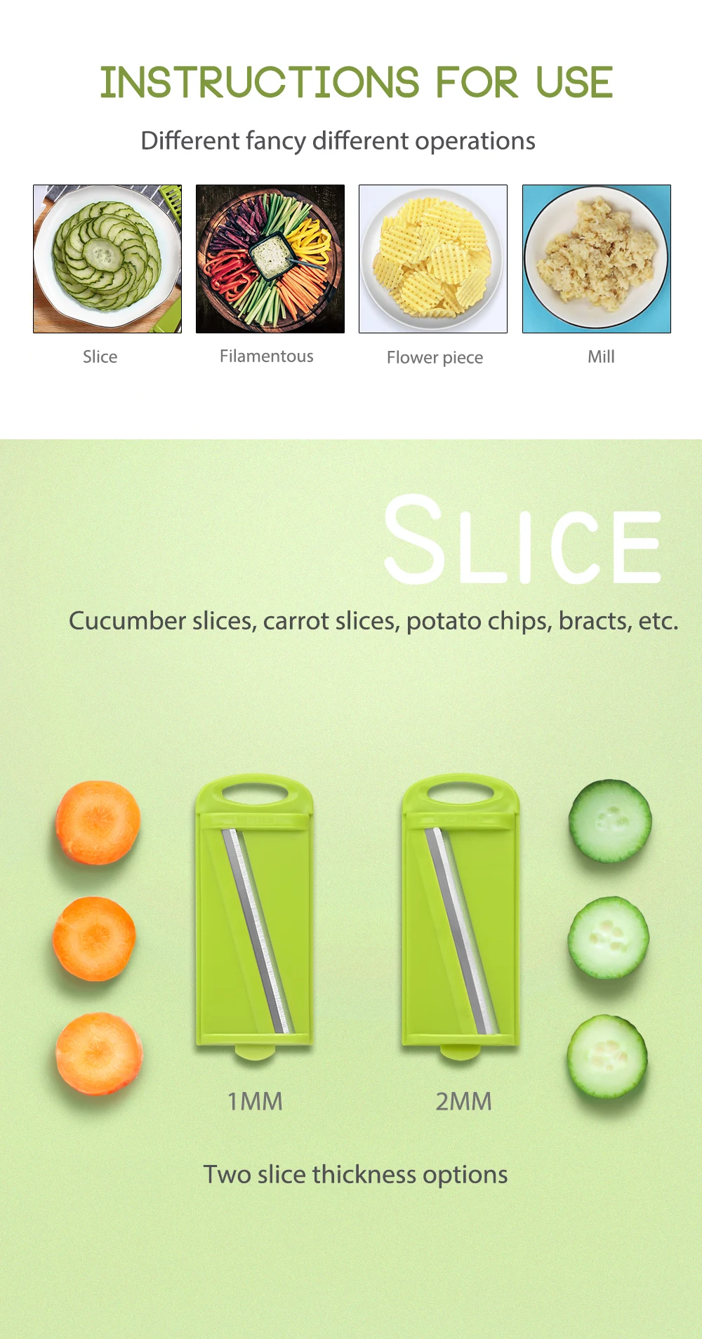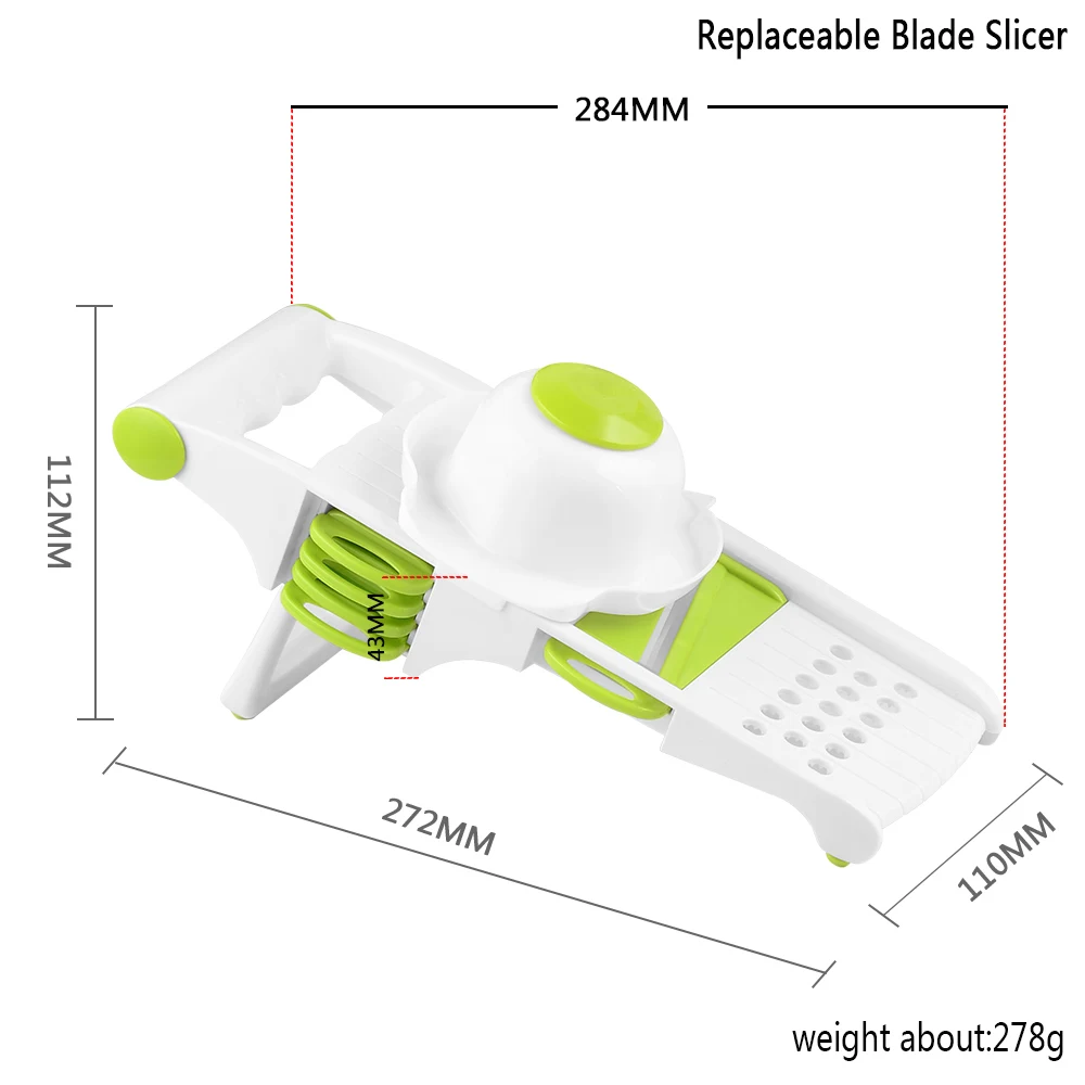 Features 5 different types of stainless steel blades for variety of slicing & cutting. This all-in-one comes with a food container base for less of a mess on the kitchen counter. Strong sharp stainless steel blades makes it easy to cut vegetables and fruits and will last for years. Notes: Light shooting and different displays may cause the color of the item in the picture a little different from the real thing. The measurement allowed error is +/- 1-3cm.