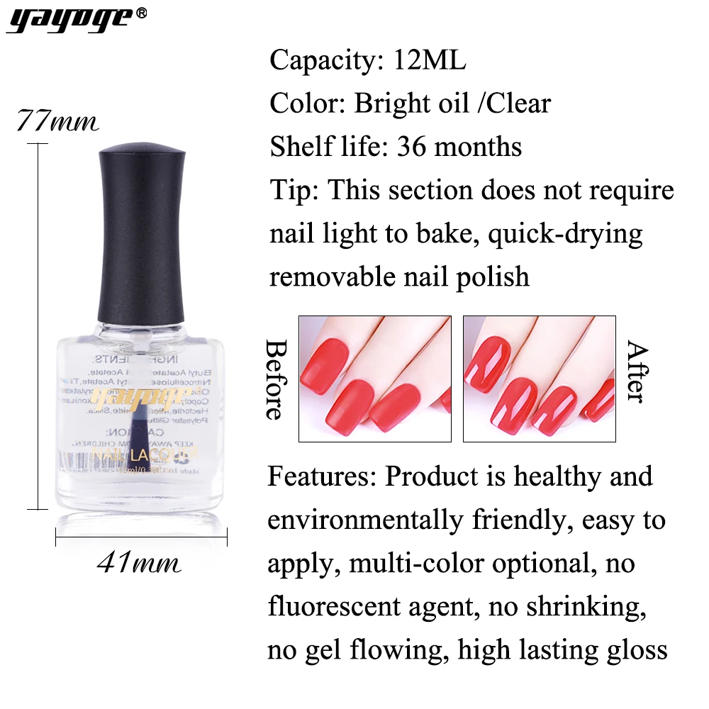 Yayoge Уход за ногтями верхнее покрытие 12 мл натуральное армирование авокадо яркое масло для лака для ногтей грунтовка для ногтей гель лак для ногтей Дизайн ногтей Описание: Тип изделия: лак для ногтей Ёмкость: 12 мл Цвет: как показано на картинке Состав: этилацетат, бутилацетат, сополимер акрилата, copcopсополимер, Nitrocellulose, Alcohol спирт, изобутират ацетата сахарозы, hecгекторит, бензиловый спирт, кремнезем, ацетилтрибутилцитрат, Benzophenone-1. Посылка включает в себя: 1 шт голографический блеск лак для ногтей Особенности: 100% новый товар высокого качества. Профессиональный качественный лак для ногтей, который придает глянцевый и стойкий цвет ногтей. Поставляется с кистью, которая делает дизайн ногтей быстро и легко для всех. Позвольте вам создать красивый дизайн ногтей в короткие сроки. Способ хранения: Герметичный, подходит для хранения в сухом и прохладном месте, Избегайте прямых солнечных лучей Функция: 1. Прочная броня, долговечная Защита от царапин, долговечная фиксация, подчеркивающая поверхность ногтей. 2. Яркое масло: верхний слой внимательен и устойчив к царапинам 1-слегка и равномерно нанесите слой грунтовки и подождите 2 минуты, чтобы полностью высохнуть. 2-равномерно нанесите слой цветного лака и подождите 3 минуты, чтобы высохнуть, (рекомендуется наносить 2 слоя цветного лака для более высокого блеска). 3-равномерно нанесите слой броневого яркого масла, подождите 3 минуты, чтобы тщательно высохнуть, и он может быть завершен. Способ удаления: Удалите ногти водой и протрите.