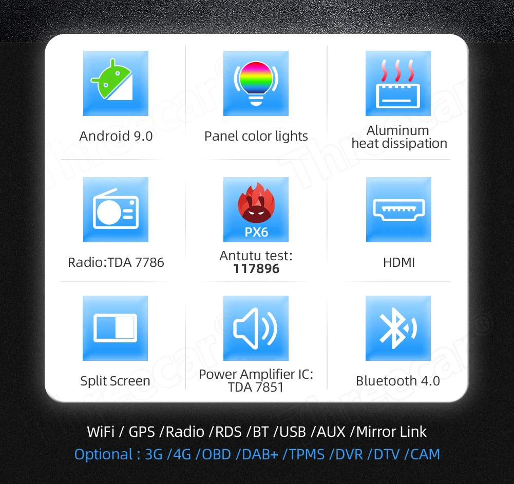 Примечание: Имеет разный стиль радио, пожалуйста, выберите, как вам нужно. Мы вышлем Радио android в соответствии с вашим выбором изображения. Пожалуйста, свяжитесь с нами. Система PX6 1.Android 10,0 (если вам нужно программное обеспечение, пожалуйста, свяжитесь с нами, его бесплатно для заказа в магазине threecar) 2. Количество ядер: 6-ядерный 3. Процессор: PX6 Cortex 3399 Core 1,8 GHz MCU: SMT32 4. ОЗУ: 4 Гб ПЗУ: 32 ГБ/64 ГБ 5. Усилитель: TDA 7851 (но DSP 7803, потому что его полный цифровой аудио процессор DSP) 6. Радио IC: TDA 7786 7. Охлаждающий алюминий цвет: синий, золотой и серебристый. Но DSP имеет только серебряный цвет. Особенности: Стандарт: радио тюнер/RDS /FM/gps-навигация/Wifi /Bluetooth/Управление рулевым колесом/сплит-экран/USB /SD/сенсорный экран/1024*600/Зеркальное соединение/HDMI порт/вид сзади камера/карта/сабвуфер/внешний микрофон Вариант: OBD2 /DAB + /DVR /4G /TV Box /TPMS Примечание: PX6 может только HDMI выходное видео, мы отправляем RCA выходной кабель не может работать. Если вам нужен конвертер HDMI в RCA, пожалуйста, свяжитесь с нами. Спасибо.