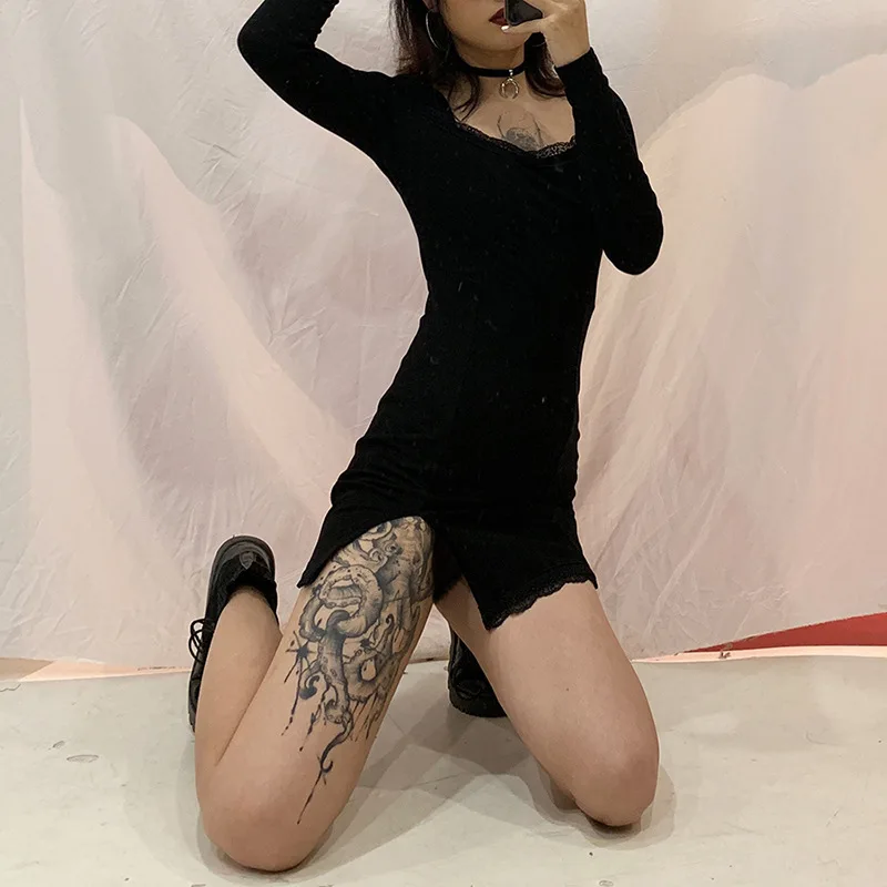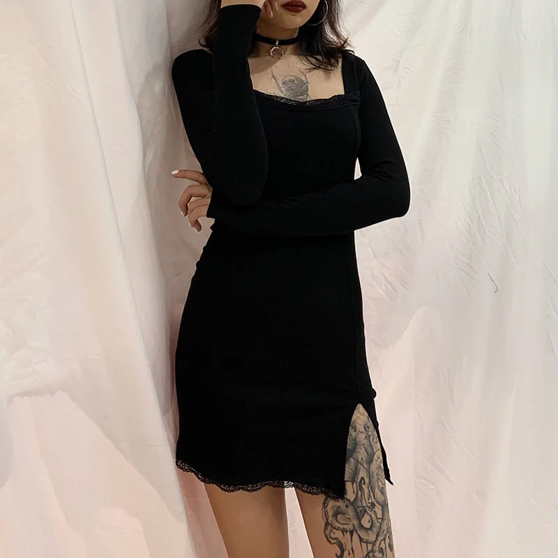 Готический Черный Для женщин кружево с длинным рукавом для женщин с сеткой и блестками Тонкий Разделение мини платье 2020 Весна гот женский темно вечерние облегающее платье