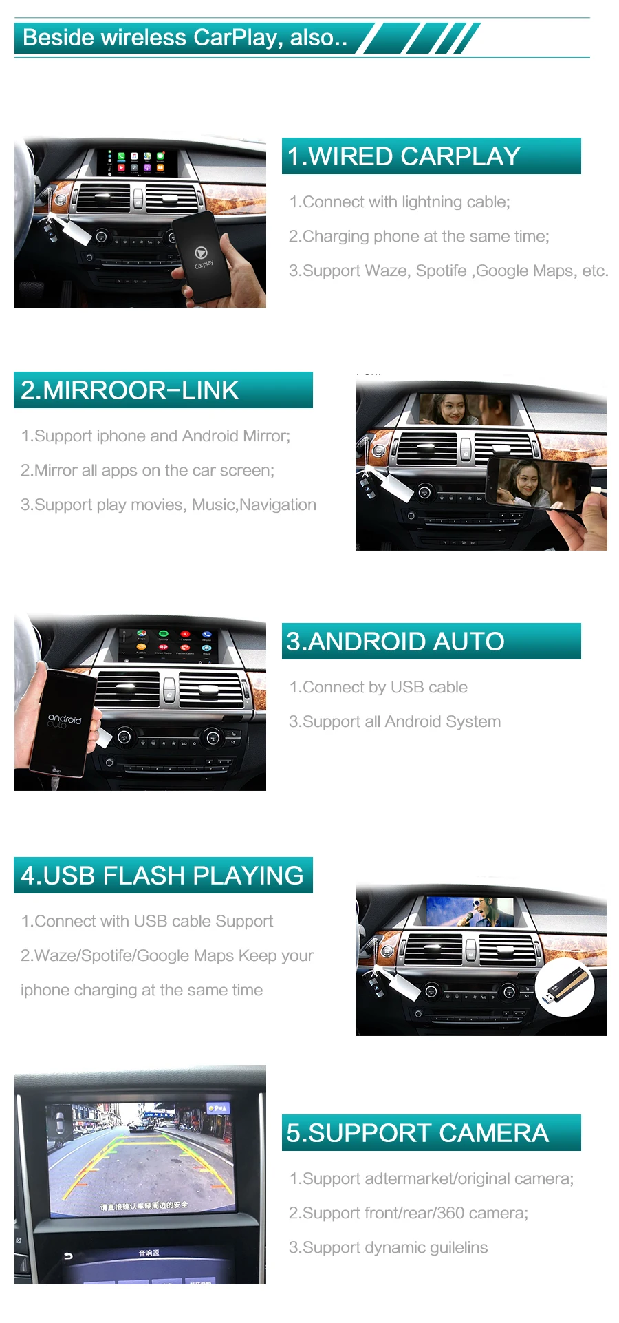 1. Работает с беспроводным Apple CarPlay, сопряжение через Bluetooth, передача через wifi. 2. Работа с проводным CarPlay также, выключите Wi-Fi сначала, подключите через кабель освещения (проводной держать ваш телефон заряжен одновременно) 3. Android Mirroring-Link для телефонов Android (ссылка для загрузки) 4. gps навигационные приложения, Google maps, Waze и Apple maps все доступны, информация о живом движении 5. Музыкальные яблоки Spotify, Apple Music, Amazon и т. Д. Аудио через заводской PCM медиа, текст на дисплее для некоторых приложений. 6. Голосовое управление: «Привет Siri…» 7. Вход для фронтальной/задней/360 камеры. (Поддерживаются динамические линии наведения) 8. USB флеш-накопитель для воспроизведения музыки и видео путем подключения usb-порта из CarPlay kit 9. Регулируемый эквалайзер. Лучшее качество звука. Выберите свой любимый стиль свободно (поп, рок, мягкий, стандартный ..) 10. Полное управление кнопками OEM. Примечание:1. Наш продукт поддерживает все размеры экрана, включая 6,5 "/8,8"/10,25.