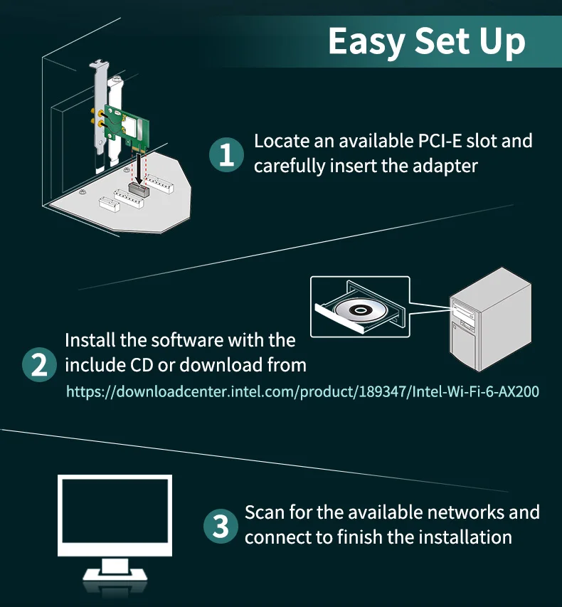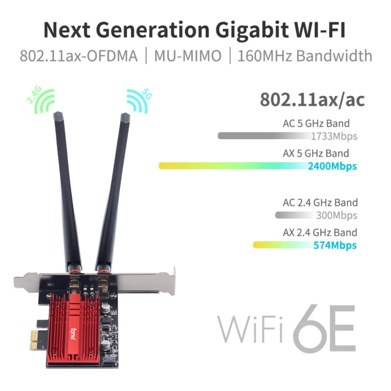 Адаптер FV-AX200 поддерживает Bluetooth 5,0 и 802.11ac/ax Wi-Fi 6, Включая функции wave 2, такие как каналы 160 МГц. Доставка до 2,4 Гбит/с и нисходящий канал MU-MIMO В качестве беспроводного доступа в Интернет Wi-Fi 6 адаптер переменного тока, он поддерживает 802.11ax весит более 2x2 MU-MIMO усики, и пиковая пропускная способность 2,4 Гбит/с, с поддержкой и Wi-Fi 5 ГГц и 2,4 ГГц. Обратите внимание: если ваша поддержка маршрутизатора 802.11ax, максимальная скорость может достигать 2,4 Гбит/с, Тепловыделение: с хорошим теплоотводом, чипы не будут повреждены.