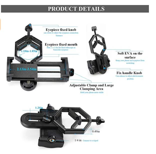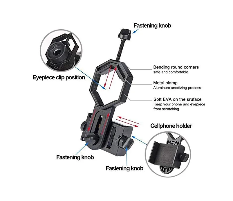 【Портативность и компактность-крепление адаптера для мобильного телефона-это светильник, вес которого выбирается для весового блока, который обеспечивает повышенную портативность, так что вы можете положить его в рюкзак или даже в карман, когда у вас есть поездка и отпуск 【Практичный и удобный 】 быстрая версия выравнивания и очень легко для нас. Выровняйте камеру и оптику за несколько секунд. Центр камеры телефона и оптика могут быть автоматически выровнены 【Наслаждайтесь исследованием fun】с этим универсальным адаптером телескопа для мобильного телефона, подключите телефон к телескопу или микроскопу, чтобы исследовать гораздо красивую сцену и удивительный микро-мир. 【Safe & durable】в основном изготовлен из алюминиевого сплава, полностью металлического корпуса, зажим для телефона изготовлен из высокопрочного пластика PA, который используется для длительного времени, потому что продукт сочетается с новым способом, телефон будет надежно закреплен на телескопе и больше не будет падать. 【Обширная Совместимость 】 подходит практически для всех брендов смартфонов на рынке с или без чехла от маленьких до больших, таких как iphone 4, 5s, 6s, 6p,7,7p, 8, X, samsung Galaxy S7,S6,Edge, Note 4,Sony,LG и многое другое