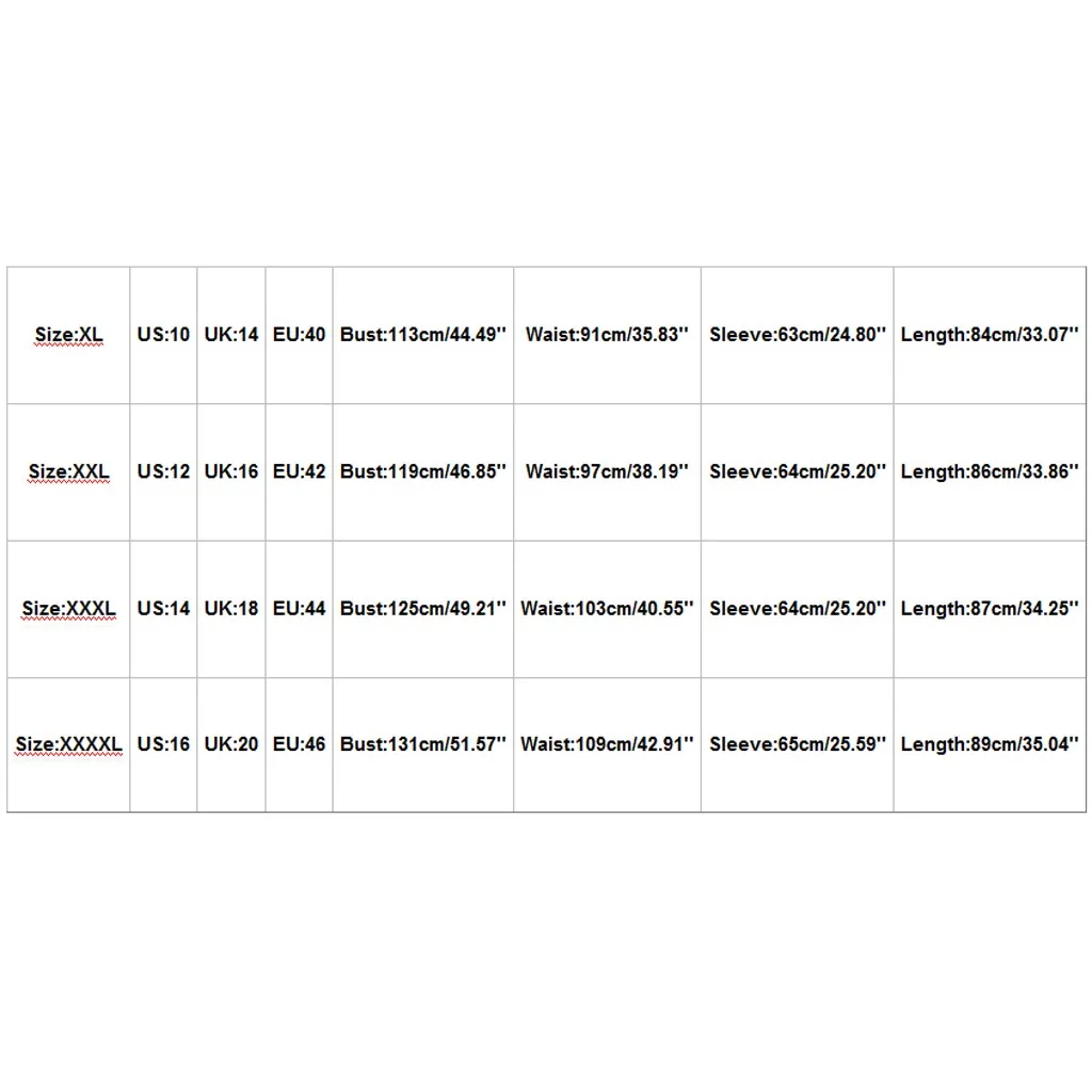 Размер США Великобритания ЕС Бюст Талия Рукав Длина XL 10 14 40 113 см/44,49'' 91 см/35,83'' 63 см/24,80'' 84 см/33,07'' XXL 12 16 42 119 см/46,85'' 97 см/38,19'' 64 см/25,20'' 86 см/33,86'' XXXL 14 18 44 125 см/49,21'' 103 см/40,55'' 64 см/25,20'' 87 см/34,25'' XXXXL 16 20 46 131 см/51,57'' 109 см/42,91'' 65 см/25,59'' 89 см/35,04''
