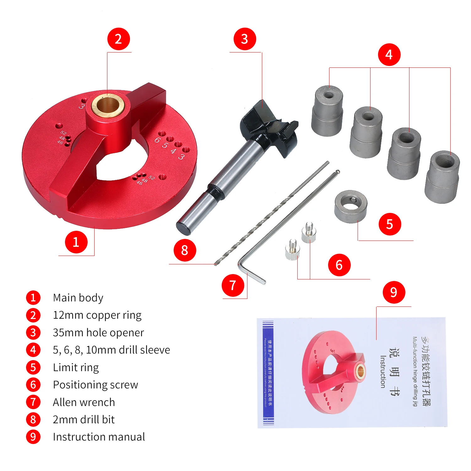 1. Пробивка петли: Этот Пробивной инструмент подходит для 35 мм петель и поддерживает 46 мм, 48 мм, 52 мм резьбовые отверстия для шарнирных чашек.