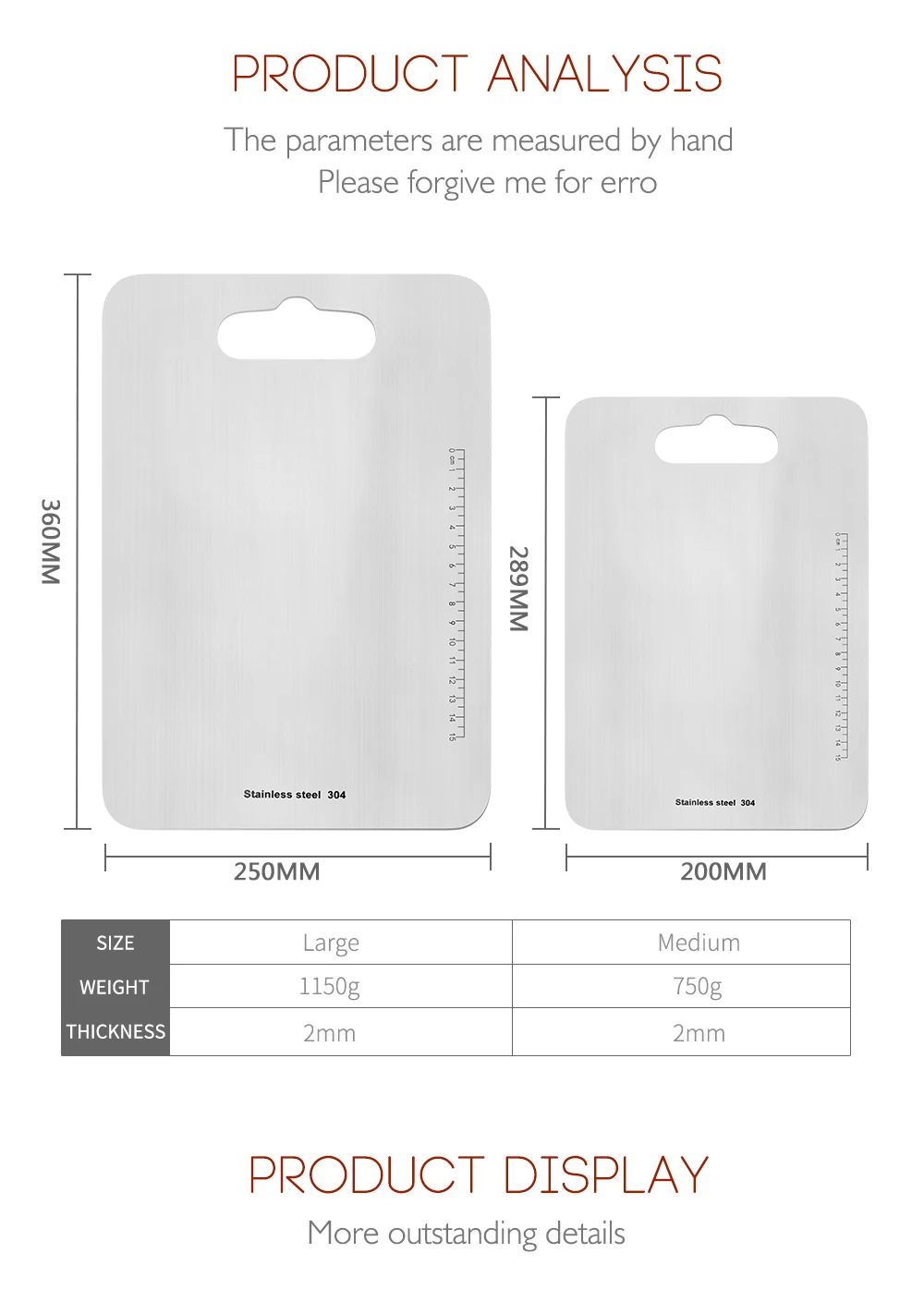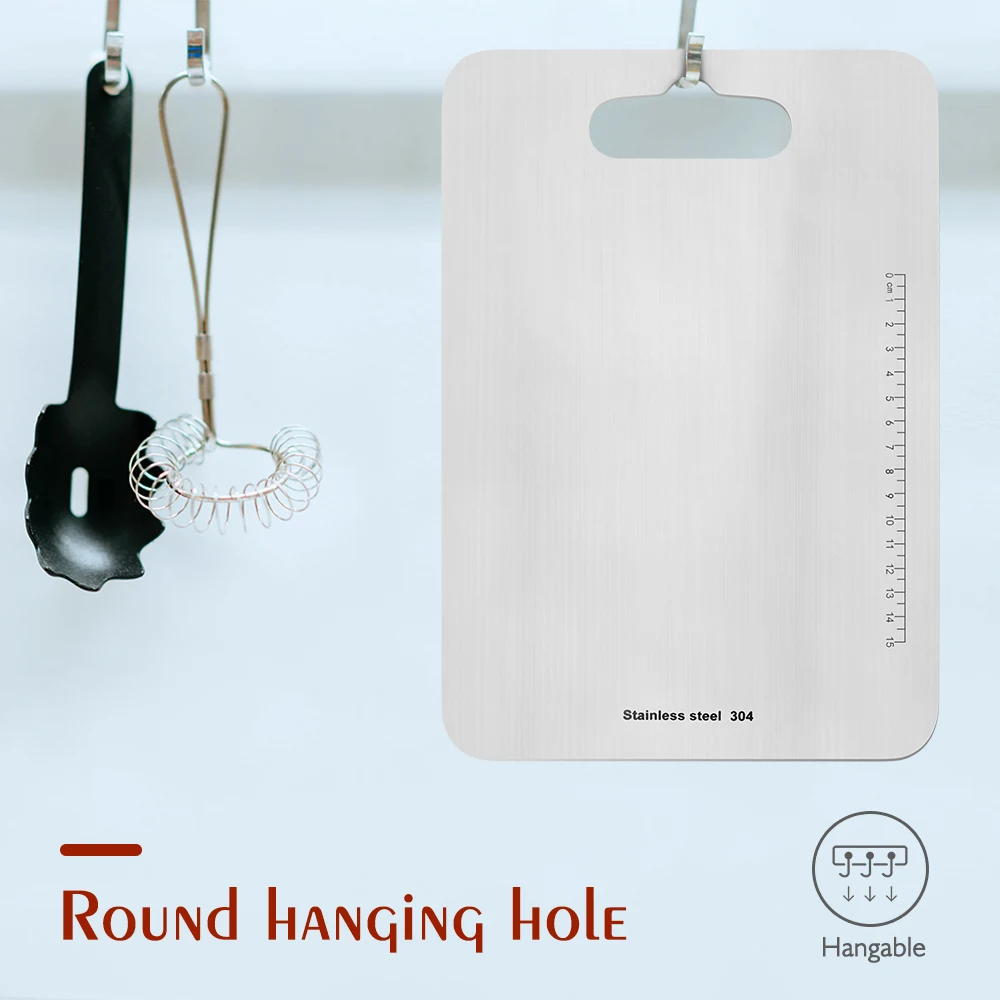 Гладкая и легко чистится: поверхность 304 пищевой нержавеющей стали является здоровой и прочной. Уникальный дизайн: металлическая разделочная доска имеет гладкую поверхность и очень хорошую сенсорную текстуру. Охрана окружающей среды: этот блок мясника может помочь вам отлично нарезать мясо, пиццу, фрукты, овощи, сыр и любую еду.