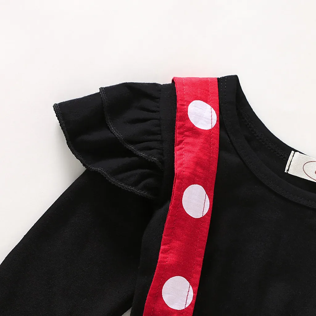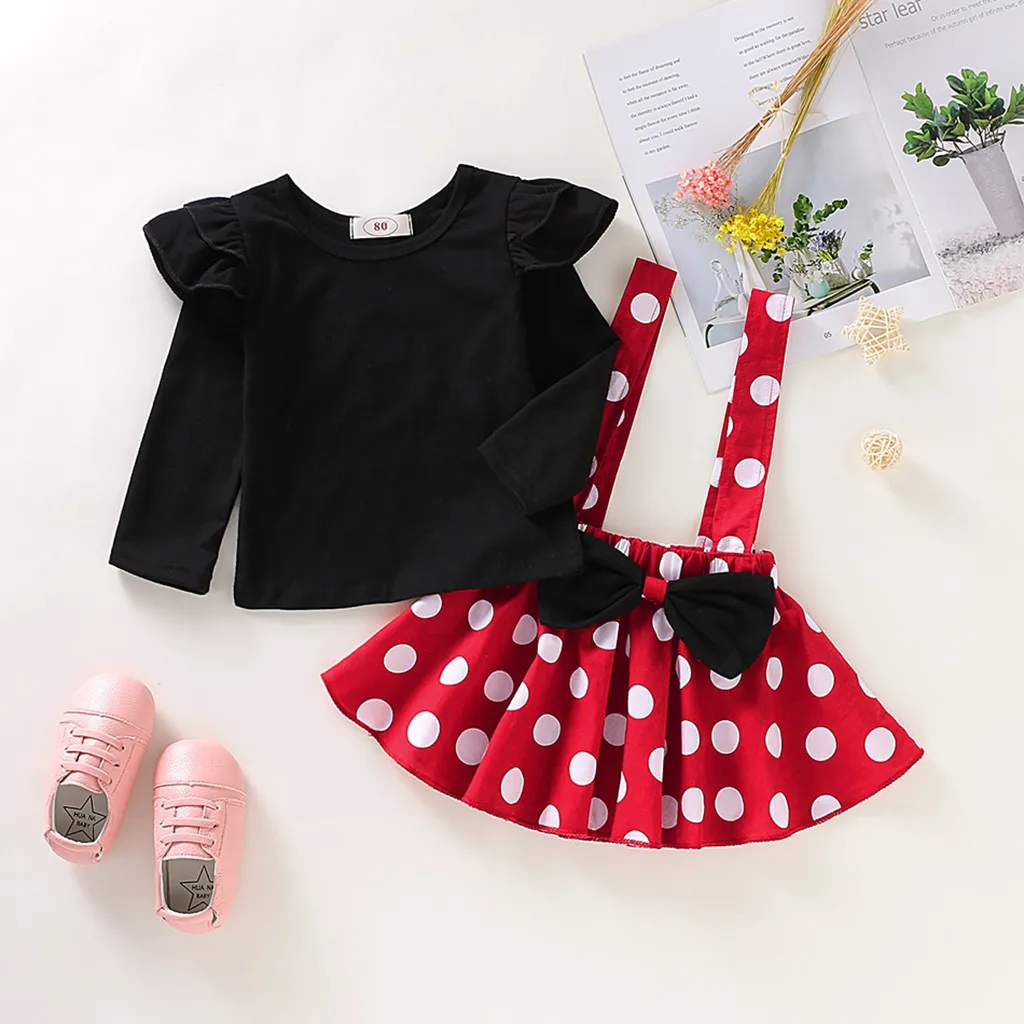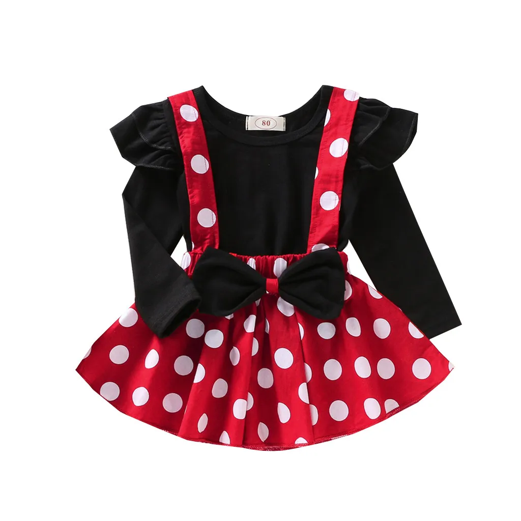 Платье для дня рождения для женщин; одежда с длинными рукавами для маленьких девочек; топы с оборками для малышей + юбка на подтяжках в горошек; комплекты одежды