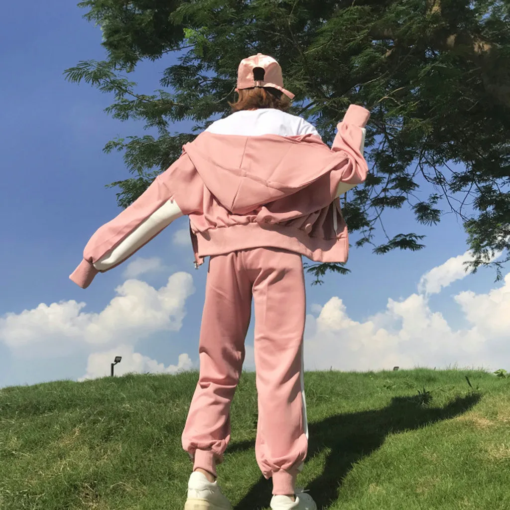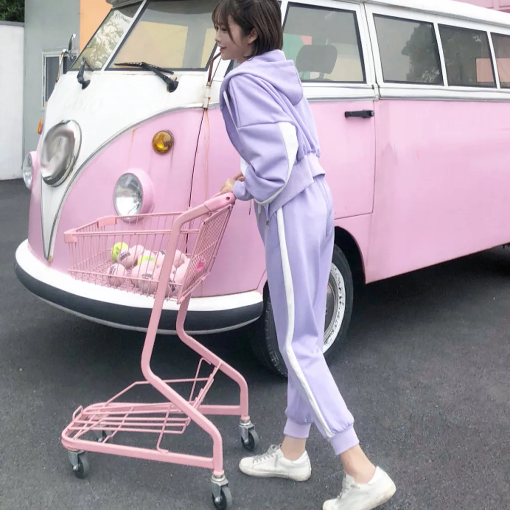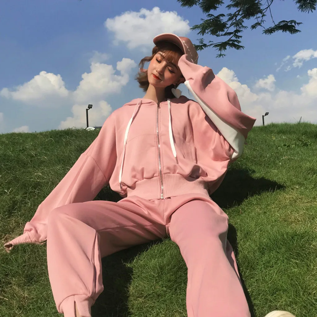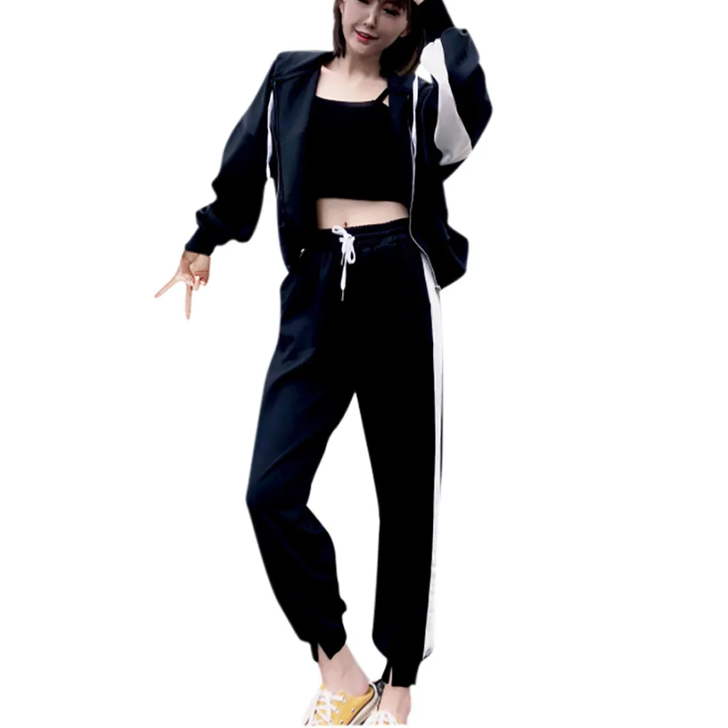 Женский комплект из двух предметов, топ на молнии с капюшоном и карманами и длинными рукавами и повседневные спортивные штаны