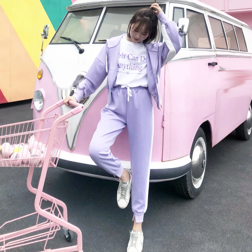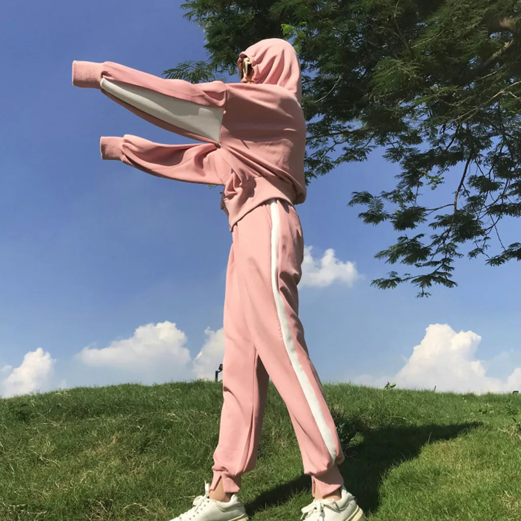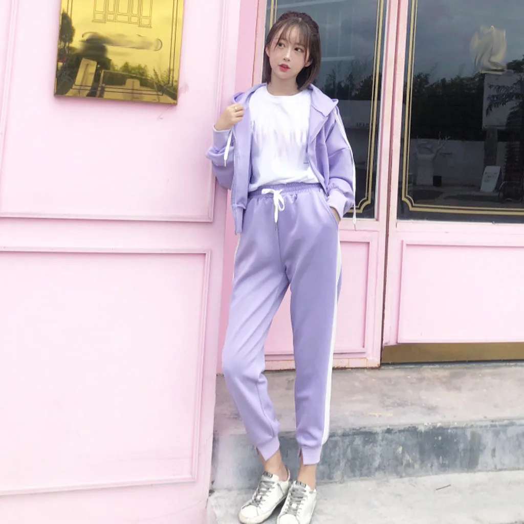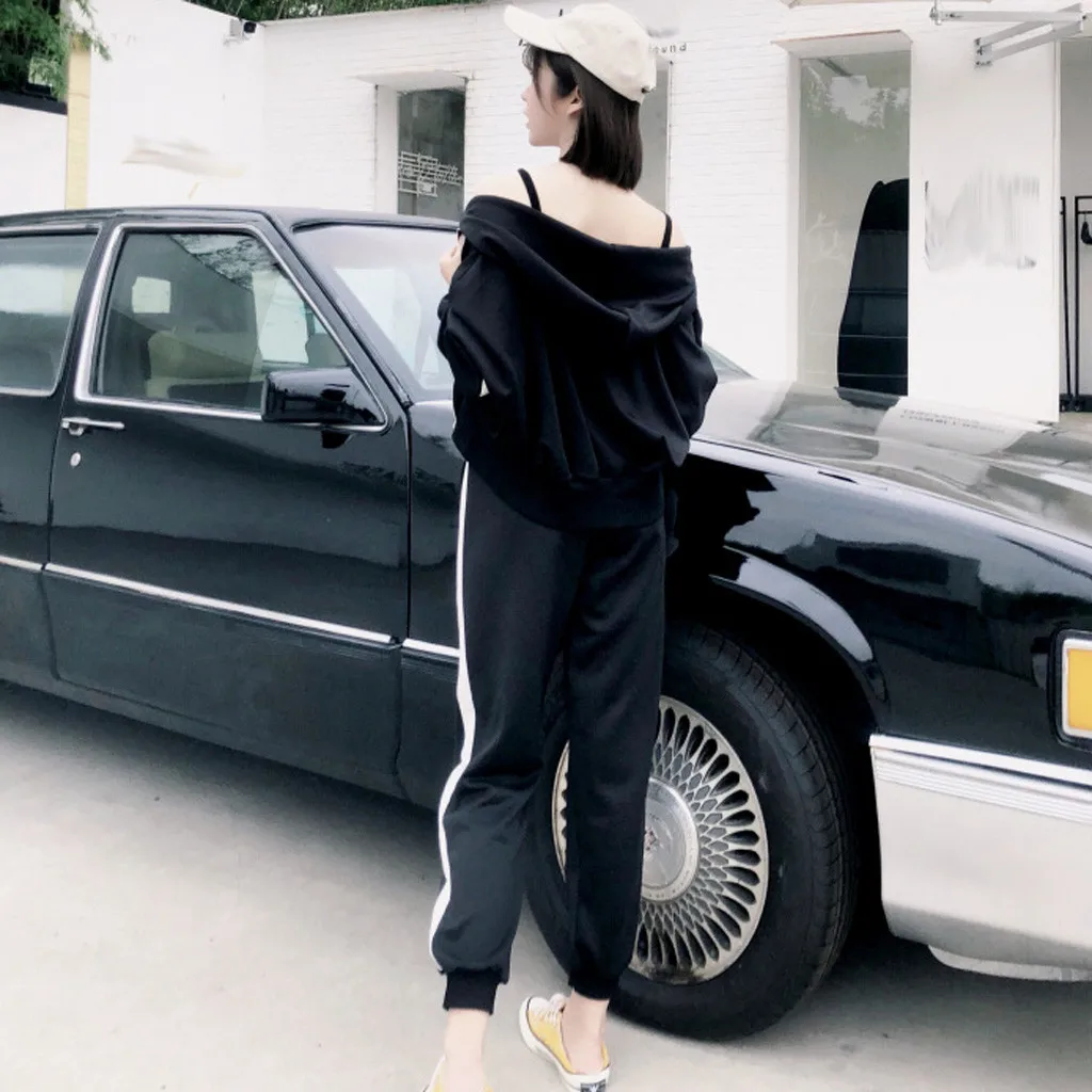 Женский комплект из двух предметов, топ на молнии с капюшоном и карманами и длинными рукавами и повседневные спортивные штаны