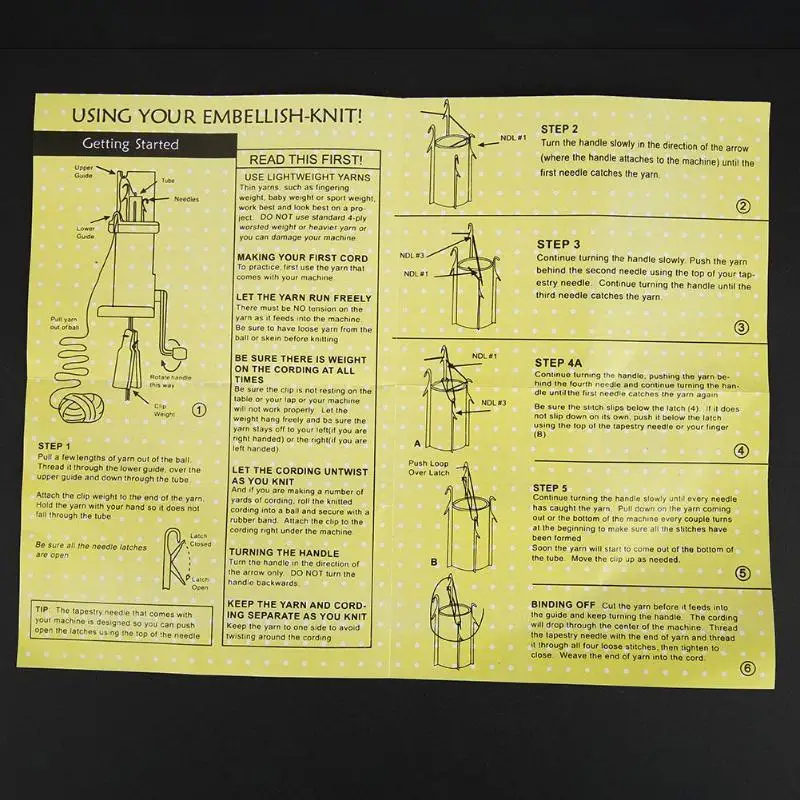3. Используйте легкую пряжу: тонкую пряжу, такую как вес, вес ребенка или спортивный вес, работайте лучше и лучше всего смотрите на проект. Не используйте стандартный диагностический вывод 4 слойные хуже вес или тяжелее пряжи или вы повредите вашу машину.