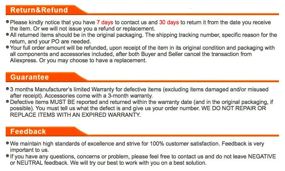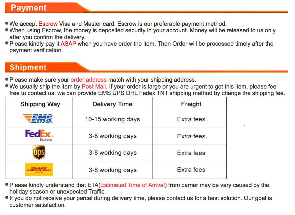 Постоянна поддержка при доставке! Оптовая продажа поддержка! Фотографии предоставлены для реселлеров! Примечание: (пожалуйста, прочитайте его перед размещением заказа! спасибо) Товар доставляется бесплатно через «Почта Китая Ordinary Small Packet Plus», он не может быть отслежен после того, как посылка покинет Китай. если вам нужно полное отслеживание, пожалуйста, выберите «Почта Китая зарегистрированной воздушной почтой» или другую доставку. Если ваше время подтверждения близится, вы все еще не получили товар, пожалуйста, свяжитесь с нами, мы продлим дату доставки в первый раз. Пожалуйста, не открывайте спор в течение 65 дней. Если после 65 дней вы все еще не получили товар, пожалуйста, свяжитесь с нами, чтобы решить его.