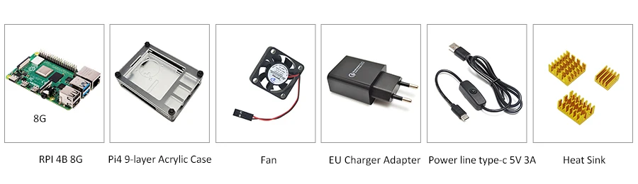 1.Raspberry Pi 4 Модель B- 8 Гб RAM 2.Raspberry pi 4B чехол, новинка, для возраста от 9 слоев чехол 3.Raspberry Pi 4 B радиатор 4. Адаптер зарядного устройства европейского стандарта 5. Интерфейс переключателя питания type-c