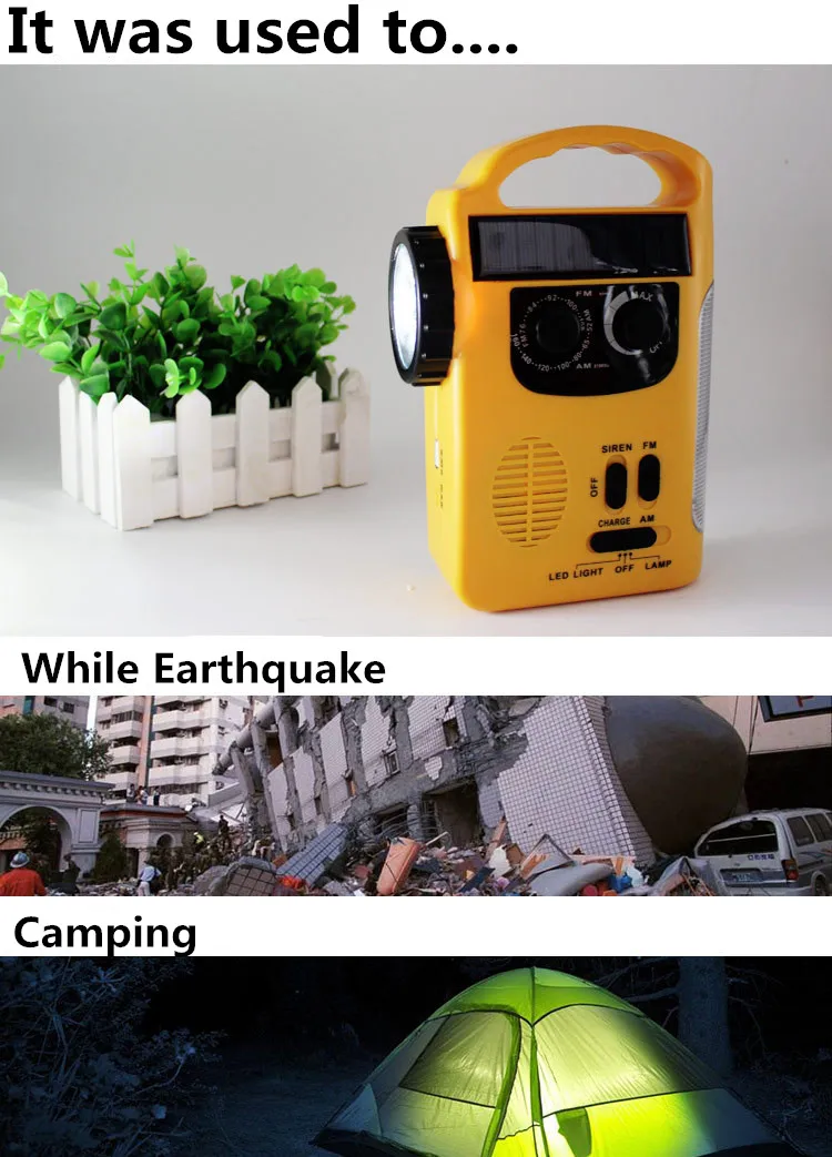 Светильник с 13 светодиодами, высокая яркость, долгий срок службы, до 100000 часов С AM / FM радио: AM: 530 - 1710 кГц, FM: 87,5-108 МГц или 76-108 МГц Сигнализация составляет около 120 дБ Уровень звука сирены: 100 дБ Источник питания: Динамо, аккумулятор, солнечная батарея