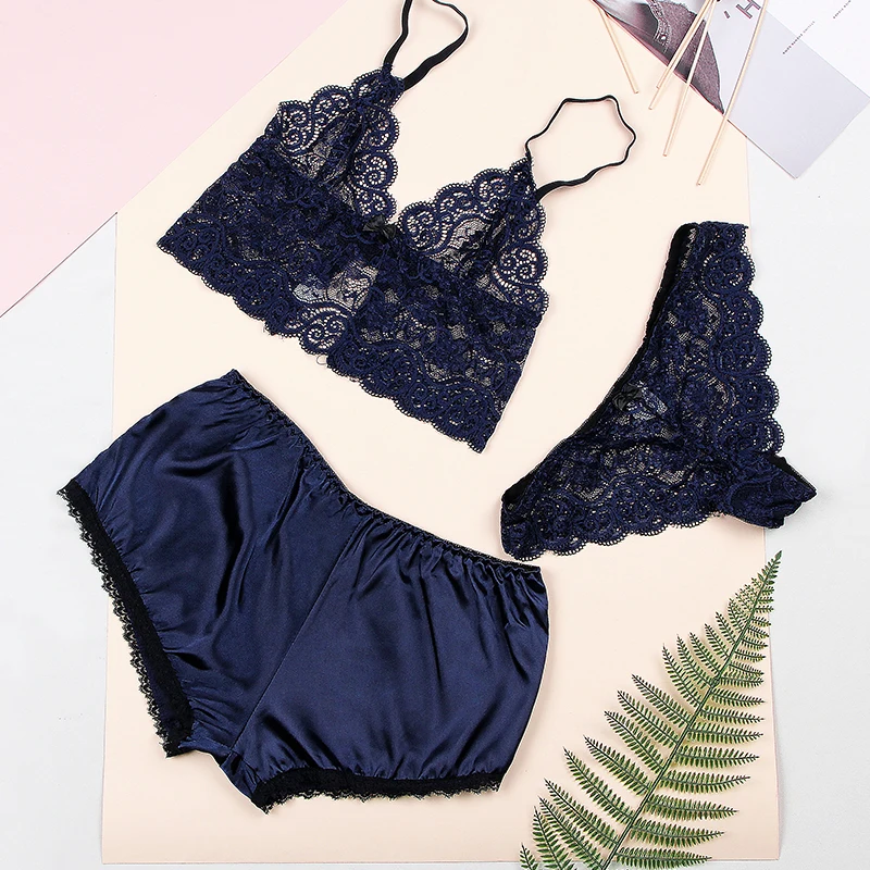Ohyeahlover 3 шт., кружевная Пижама, Сексуальный Атласный топ на бретельках, пижамный комплект с V-образным вырезом, одежда для сна, повседневный домашний костюм RM80900
