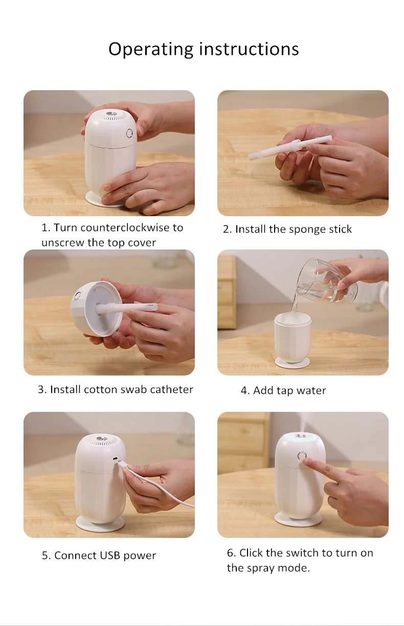 1. Чтобы предотвратить засорение дыр тумана, используйте водопроводную воду или минеральную воду. Не добавляйте никаких коррозионных эфирных масел. 2. Емкость резервуара для воды составляет 300 мл, пожалуйста, не превышайте стандарт. 3. Этот продукт питается от 5 В, подключен к компьютеру USB или выходному адаптеру 5 в 4. После подключения питания USB нажмите переключатель, чтобы включить непрерывный распылитель. Автоматически выключается через 4 часа, нажмите переключатель во второй раз, чтобы переключиться на прерывистый спрей (спрей 3 s стоп 3 s) автоматически выключается через 6 часов, нажмите переключатель, чтобы повернуть Выключите спрей в третий раз 5. нажмите и удерживайте кнопку 1,5 s, чтобы включить цветной светильник s. второй Длительное нажатие 1,5 s, чтобы зафиксировать светильник цвет. третий длинный нажмите 1,5 s, чтобы выключить ночь Светильник