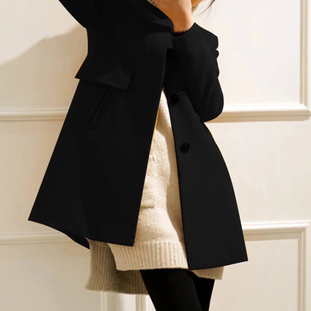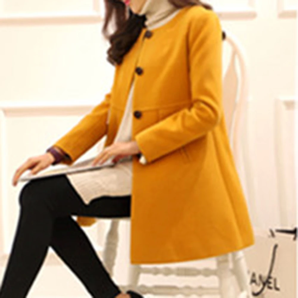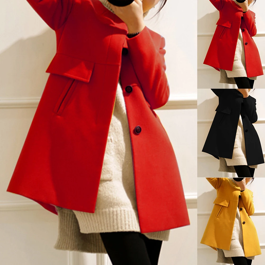 Женский зимний шерстяной плащ с длинным рукавом и круглым вырезом на пуговицах размера плюс