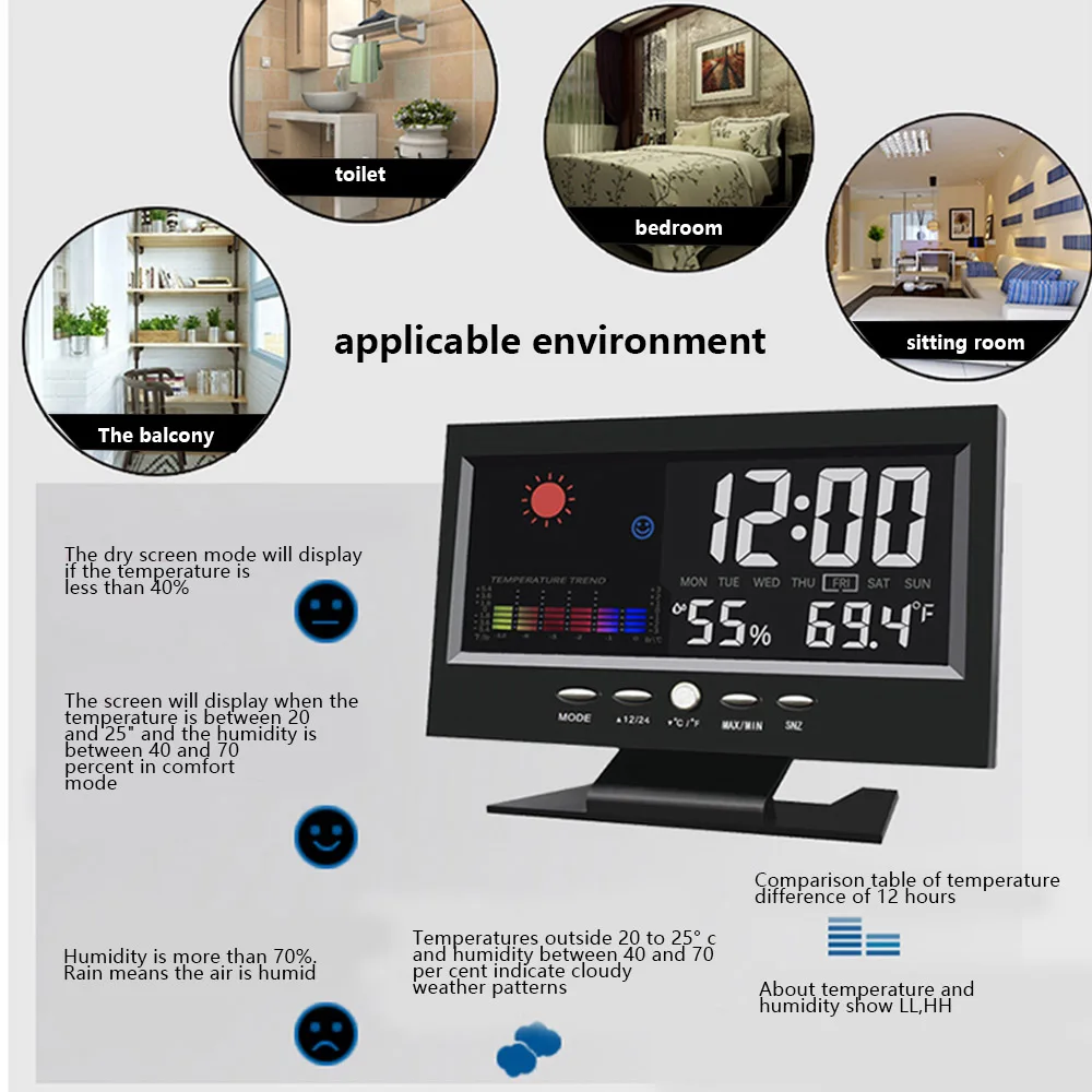 8082T-это сравнительные погодные часы с голосовым управлением, которые определяют текущий климат, основанный на температуре и влажности дня. Есть функции отображения температуры, влажности, времени, даты. Он также имеет функцию подсветки с голосовым управлением.