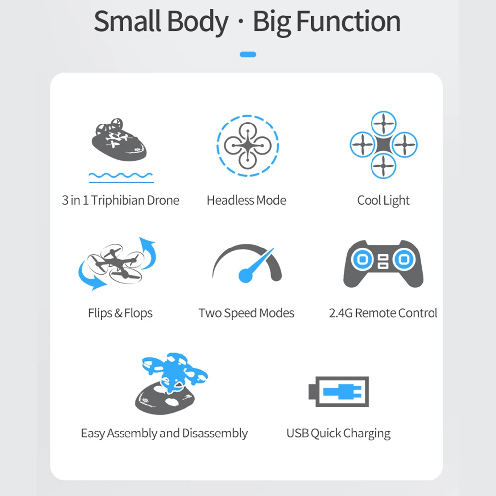 -Мини-Дрон-автомобиль-лодка 3 в 1: с инновационным съемным дизайном, ваш самолет может свободно переключаться в трех режимах-Воздушный режим, режим заземления и режим воды-Позвольте вам наслаждаться забавой игрушек. Надежный и фантастический трюк с поворотом на 360 ° пригодится даже для новичков дронов