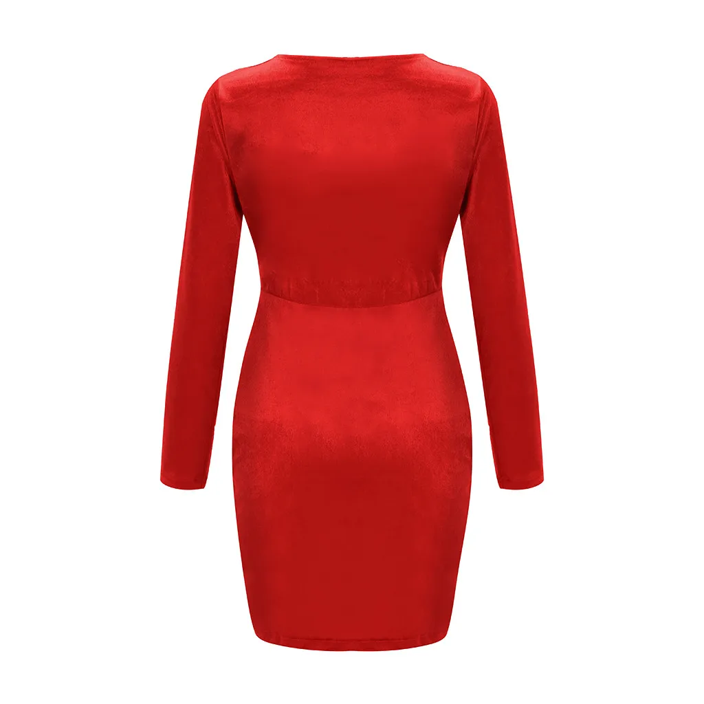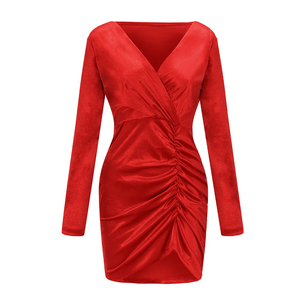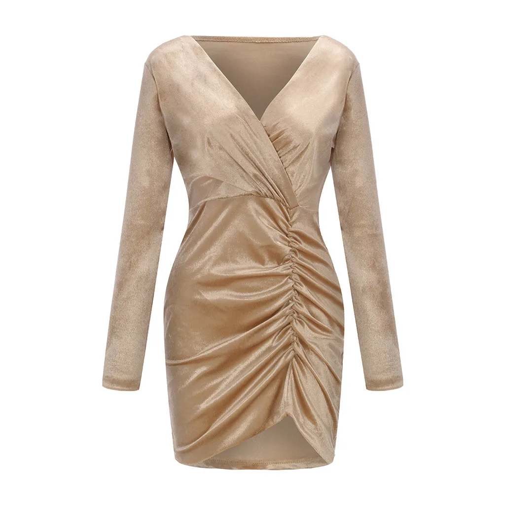 Женское сексуальное однотонное бархатное мини-платье с v-образным вырезом и длинным рукавом