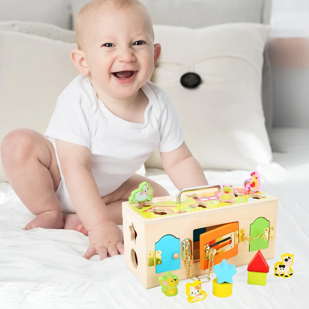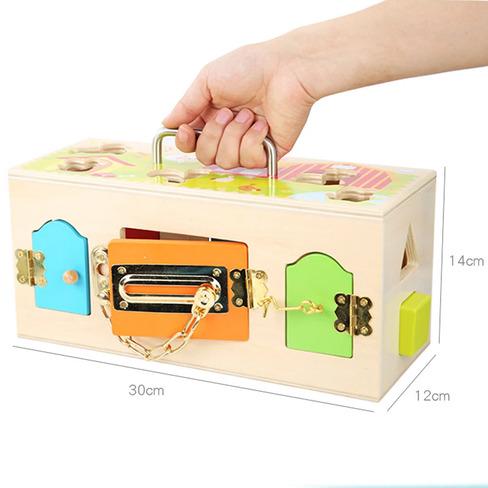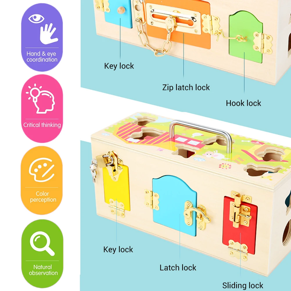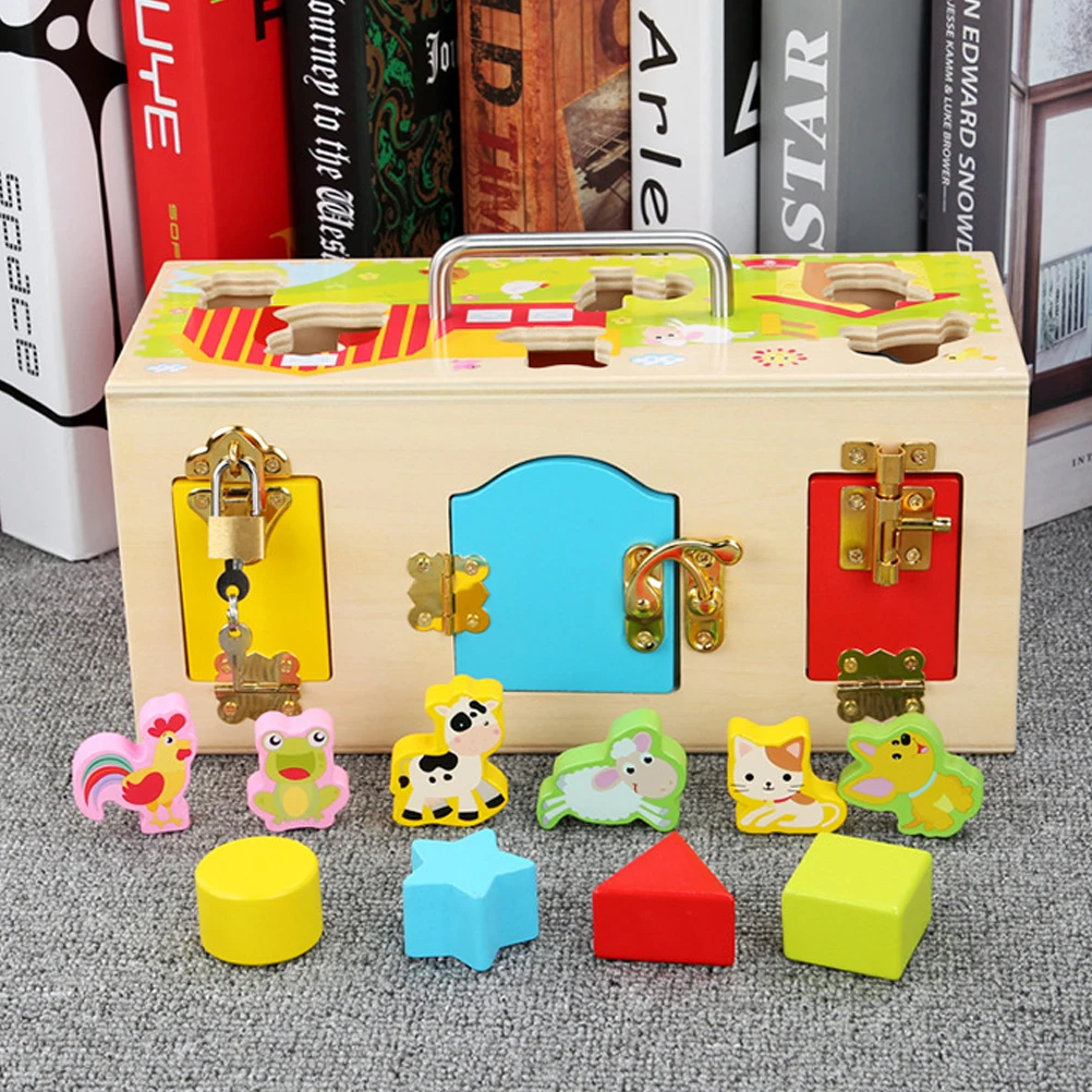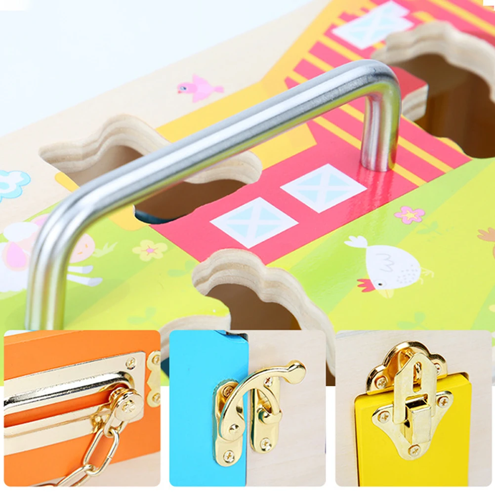 Простота в использовании: лакированный деревянный сарай с пряжкой и замком на двери, который может быть открыт и закрыт, чтобы помочь детям разблокировать и создать пару.