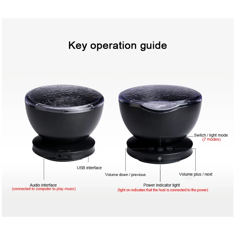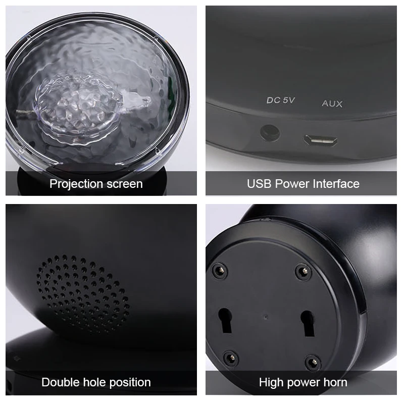 3. Прожекторная лампа может быть подключена к 3,5 мм аудио интерфейсным устройствам, таким как мобильные телефоны, ПК, ноутбуки, mp3. Он прост в использовании и готов к использованию. Проектор морской тематики со встроенными динамиками высокой мощности. Оснащен аудиосистемой в базе для обеспечения более мощных акустических эффектов