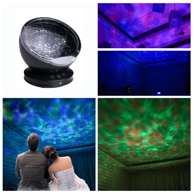 2. Светильник «океанское настроение»-это гипнотический музыкальный светильник, атмосферный проектор, устройство «все в одном», которое может читать и звучать. Встроенные 12 high-end сверхъяркий светодиодный большого размера с чипом (4 красных шариков, 4 голубых бусин, 4 зеленый бисер) может обеспечить более широкую защиту, более четкого прогноза и более длительный срок службы, и 7 видов режима обесцвечивания. Светильник отражается и трансформируется друг в друга, создавая романтическую и красочную волнистую атмосферу