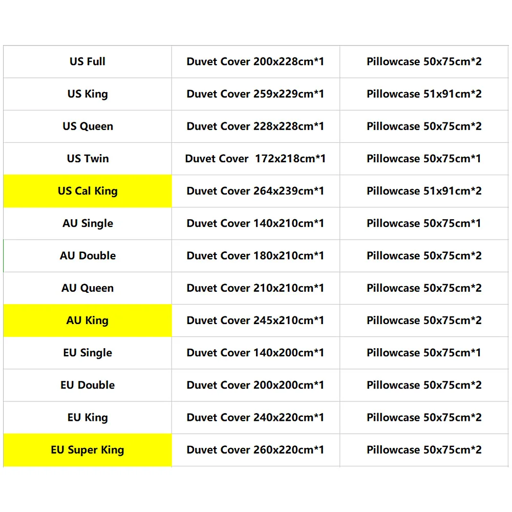 *Note: The ironing temperature cannot exceed 140 °C. *Due to sewing and thermal transfer, manual measuring, size will has about 5-8cm error. (The bedding set is not including any filling). US Twin: 1 piece Duvet Cover 172x218cm , 1 piece Pillowcase 50x75cm. US Full: 1 piece Duvet Cover 200x228cm, 2 piece Pillowcase 50x75cm. US Queen: 1 piece Duvet Cover 228x228cm, 2 piece Pillowcase 50x75cm. US King: 1 piece Duvet Cover 259x229cm, 2 piece Pillowcase 51x91cm. US Cal King: 1 piece Duvet Cover 264x239cm, 2 piece Pillowcase 51x91cm. AU Single: 1 piece Duvet Cover 140x210cm,1 piece Pillowcase 50x75cm. AU Double: 1 piece Duvet Cover 180x210cm, 2 piece Pillowcase 50x75cm. AU Queen: 1 piece Duvet Cover 210x210cm, 2 piece Pillowcase 50x75cm. AU King: 1 piece Duvet Cover 245x210cm, 2 piece Pillowcase 50x75cm. EU Single: 1 piece Duvet Cover 140x200cm,1 piece Pillowcase 50x75cm. EU Double: 1 piece Duvet Cover 200x200cm, 2 piece Pillowcase 50x75cm. EU King: 1 piece Duvet Cover 240x220cm, 2 piece Pillowcase 50x75cm. EU Super King: 1 piece Duvet Cover 260x220cm, 2 piece Pillowcase 50x75cm. Pillowcase: 1 piece 50x75cm, or 1 piece 51x91cm. Bed Sheet: 1 piece 220x230cm, or 1 piece 220x260cm *This is the design picture show of the bedding set. Not a actual image so that maybe look a little different in real life. Its may a little different between the item u saw with the real item, due to different screens monitor, sunlight,background. *This bedding set is Custom to order. But it will ship very quickly and you will get a tracking number when it ships.
