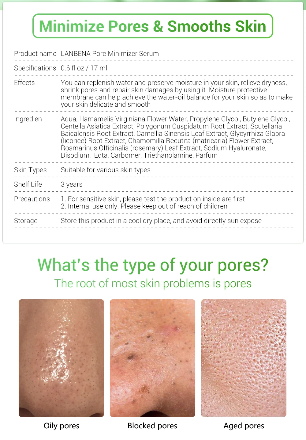 3 основных эффекта LANBENA пор минимайзер сыворотка -Минимизировать поры -Разглаживает кожу -Глубокое увлажнение