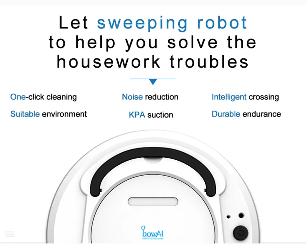Особенности:1. Тщательная очистка: 1800 ПА интенсивного всасывания. Легко впитывает пыль, волосы, семена, крошки хлеба, семена и другие мусор в повседневной жизни, очень большой мусорный бак должен быть Опорожнен только изредка.2. Запуск одной кнопкой, подметание, уборка, пылесос три в одном, маленький размер, гибкий, чтобы иметь дело с мертвыми углами, такими как диван-кровать.3. Несколько режимов очистки, которые относительно очистят ваш пол с помощью умной навигации по пути. Ультра-тонкий 68 мм дизайн может достигать тех труднодоступных мест, под диван или кровать, решает проблемы нежелательных волокон и волос.4. Быстрая Чистка, без случайных ударов. Встроенные датчики обеспечивают Предотвращение падений, предотвращение столкновений, предотвращение ловушек,5. Система обнаружения местности OBS. С функцией лазания 10 мм, высота скалолазания 15 градусов, интеллектуальная индукция избегания падения.6,40 децибел, низкий уровень шума, интимный, не тревожный, это принесет вам чудесную жизнь весело.7. Зарядка завершена в течение 100 минут, очистка около 150 ㎡. Идеально подходит для плоского пола, как мрамор, плитка, деревянный пол и т. Д.Характеристики:Материал: АБС-пластикБатарея: 3,7 V 1200mAhВремя работы: около 70 минутВремя зарядки: около 2-3 часовПлощадь уборки: 150 ㎡Рабочее напряжение: 3,7 VНоминальная мощность: 3 ВтПылезащитная коробка: около 150 млРабочий шум: <40 дБВсасывание: 1200PAСрок службы: >2 годаВес нетто: 580 г/20,46 унцийЦвет: черный, серый, белыйРазмер (Д * В): 258x6 8 мм/10,16x2,68"Функции: запуск одной кнопкой, подметание, уборка, пылесос, зарядка через USB, универсальное вождение, автоматическое Предотвращение препятствий, защита от падения, низкий уровень шума, сильное всасывание, низкое повторение, высокий охватРуководство по эксплуатации:1. Режим переключения: нажмите на хост-переключатель, уборочная машина входит в рабочий режим и загорается Рабочая лампа. Нажмите главный выключатель снова, чтобы выключить уборочную машину.2. Режим зарядки: Подключите зарядную головку usb-кабеля к зарядному порту уборочной машины и подключите usb-головку к конвертеру для зарядки.3. Состояние зарядки: светильник индикатора зарядки включен, что указывает на то, что зарядка находится в процессе, и выключение означает, что зарядка завершена. Общее время зарядки составляет около 2-3 часов.Внимание:1. Пожалуйста, допускайте небольшие отклонения в размере из-за измерения человеком.2. Грязь может быть выдуто из впускного отверстия, поэтому, пожалуйста, опустите коробку от пыли после каждого использования.3. Удалите аккумулятор, когда не используете пылесос.Посылка включает в себя:Робот-пылесос-1 шт.1 x зарядный кабель1 х ткань1 x КистьРуководство по эксплуатации-1 шт.