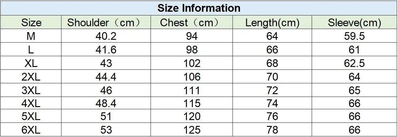 Из-за различных методов измерения Мануэля и интенсивности растягивания одежды, размеры этой таблицы размеров имеют около 2-5 см отклонения. Если вы не уверены, какие размеры подходят для вашего тела, пожалуйста, свяжитесь с нами и оставьте сообщение о вашей груди и ширине плеч, мы порекомендуем вам правильный размер.