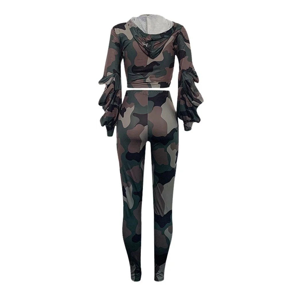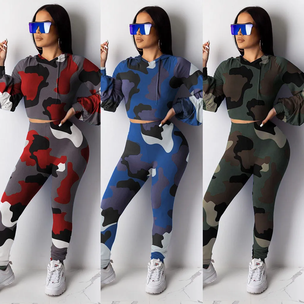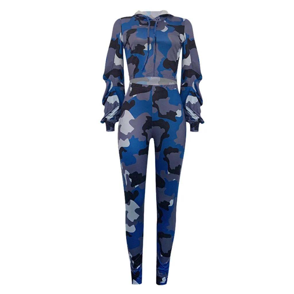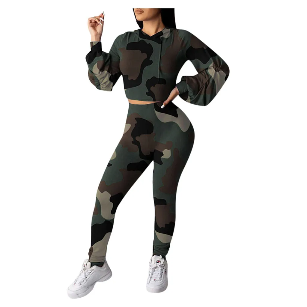 Женский 2 шт Повседневный Камуфляжный с длинным рукавом укороченный топ с капюшоном длинные брюки костюм