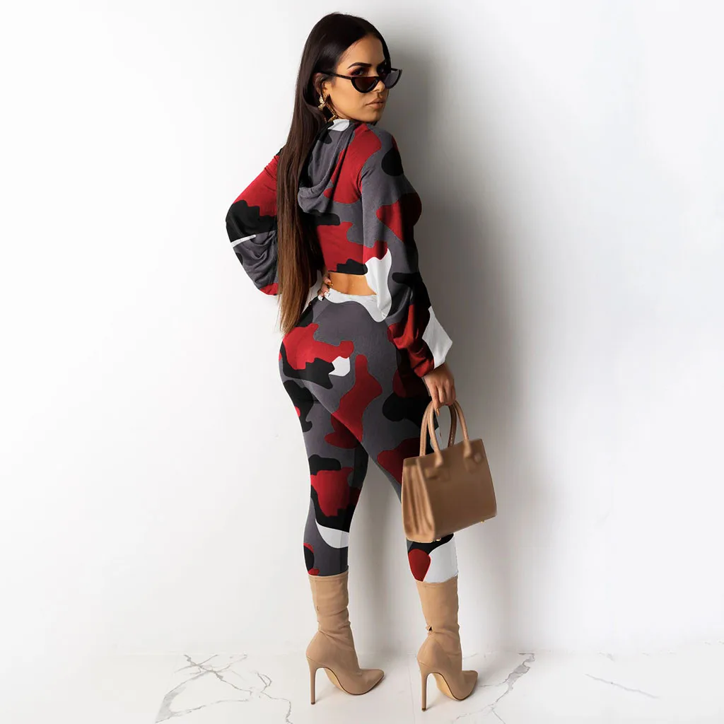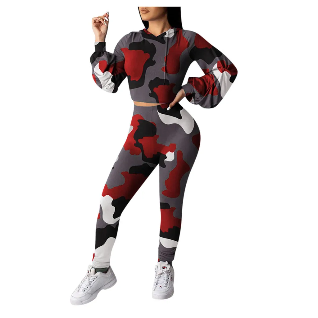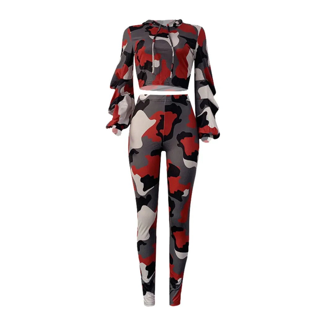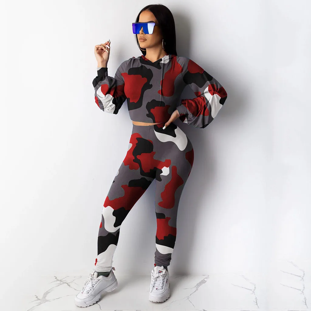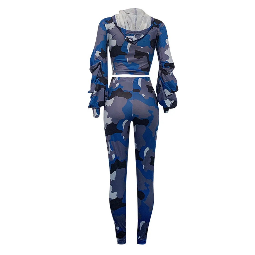 Женский 2 шт Повседневный Камуфляжный с длинным рукавом укороченный топ с капюшоном длинные брюки костюм