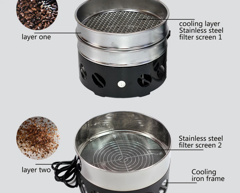 Название продукта AC осевой вентилятор кулер Вентилятор модель AA8025HB-AT Вращения 2800 об/мин Емкость 400 г/партия Время охлаждения 1-2 минуты Черного цвета Размеры; высота каблука 18 см X 6,5 см Приложения охлаждающие кофейные зерна/соевые бобы и орехи быстро 1. Система низкого шума Дизайн свести к минимуму шум позволяет пользователям не раздражает шумов при жареного кофе в зернах, а затем охлаждаются. Как только пользователь поставит кофейные зерна на охладитель после обжарки, он/она может сделать другие вещи. 2. Двигатель с большим объемом воздуха Применение мотора большого объема воздуха в 3000 об/мин дает возможность охладить жареные кофейные зерна с самой быстрой скоростью. Если кофейные зерна охлаждаются в холодильнике с помощью проволочной сетки или фильтрующей сети, двигатель с большим объемом воздуха 3000 об/мин быстро охлаждает Горячие зерна. 3. Система быстрого охлаждения Была применена система быстрого охлаждения, которая может охладить жареные кофейные зерна самым быстрым и самым тихим образом, а аромат и аромат жареных зерен можно поддерживать в течение длительного времени. Поскольку охладитель принимает систему быстрого охлаждения, жареные кофейные зерна можно хранить, или измельчать и пробовать сразу.